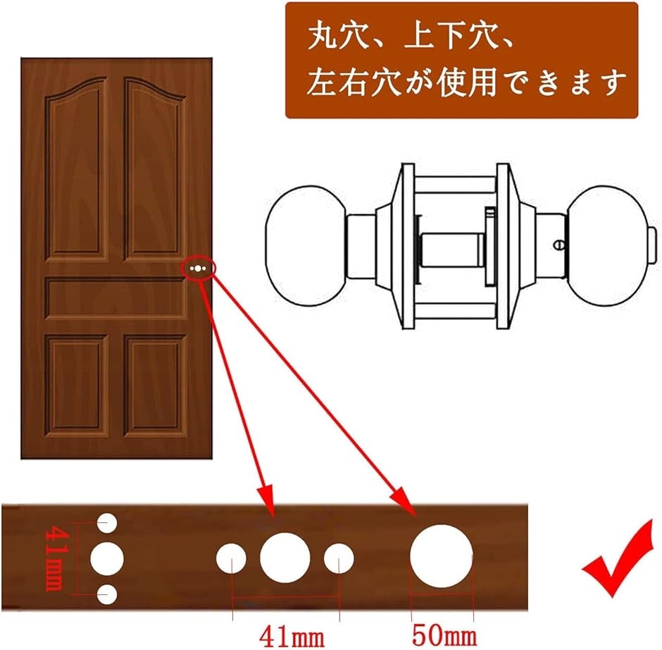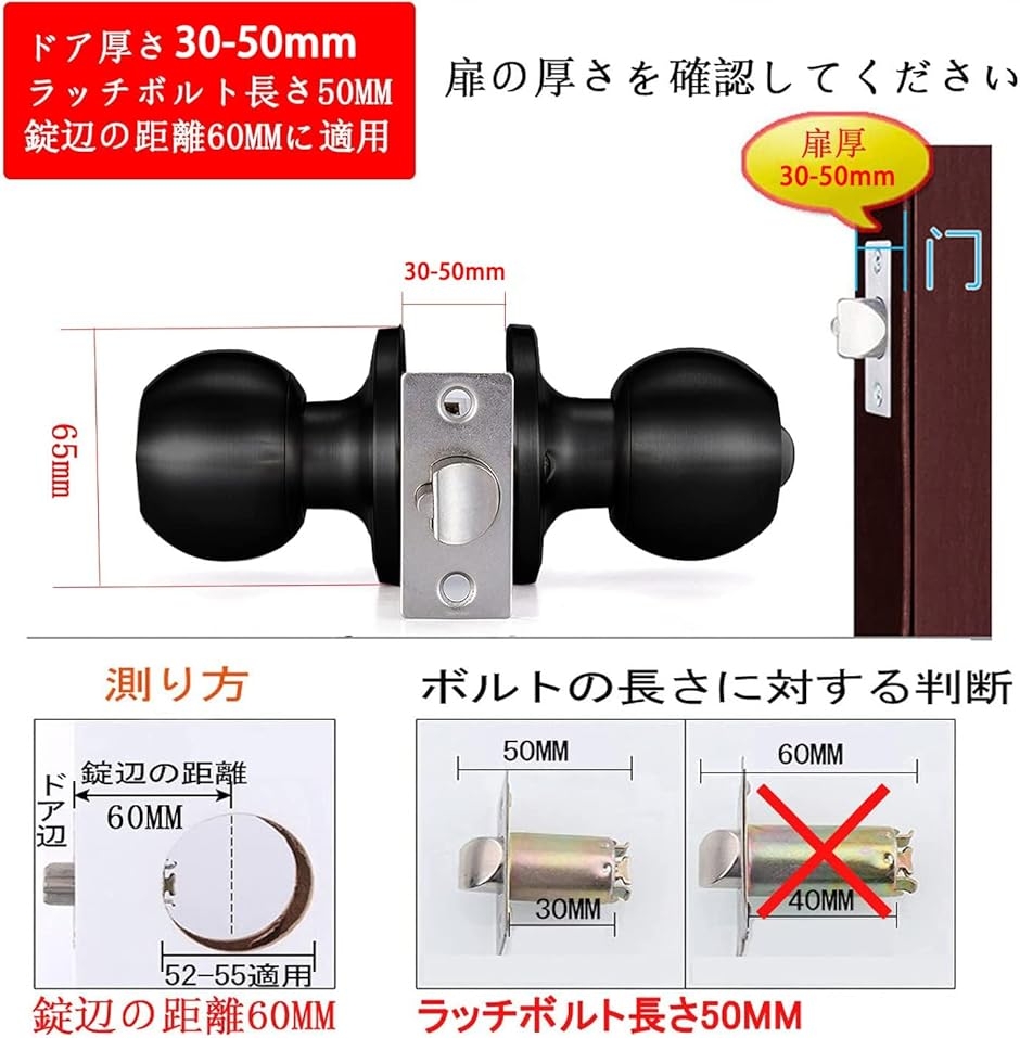 「鍵なしの仕様」ドア厚さ 35-50mm ラッチボルト長さ50MM 錠辺の距離60MMに適用。