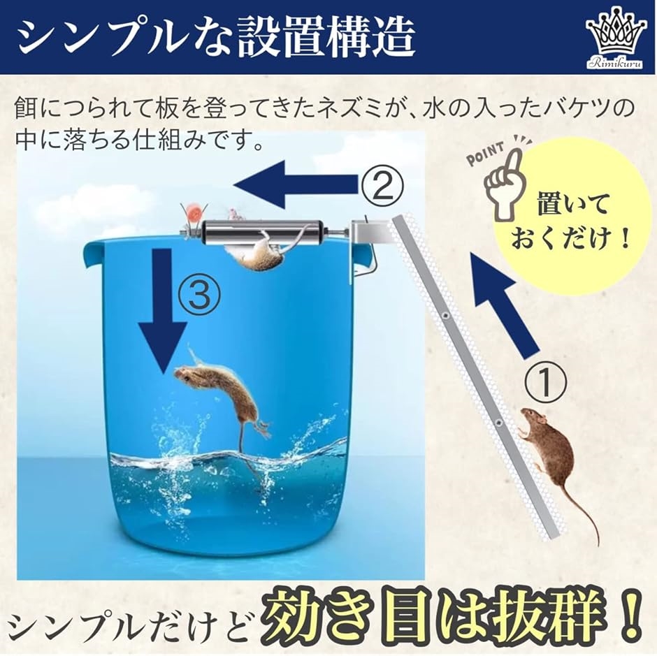餌につられて板を登ってきたネズミが、水の入ったバケツのなかに落ちる仕組みで、誰でも簡単にネズミ駆除ができます。