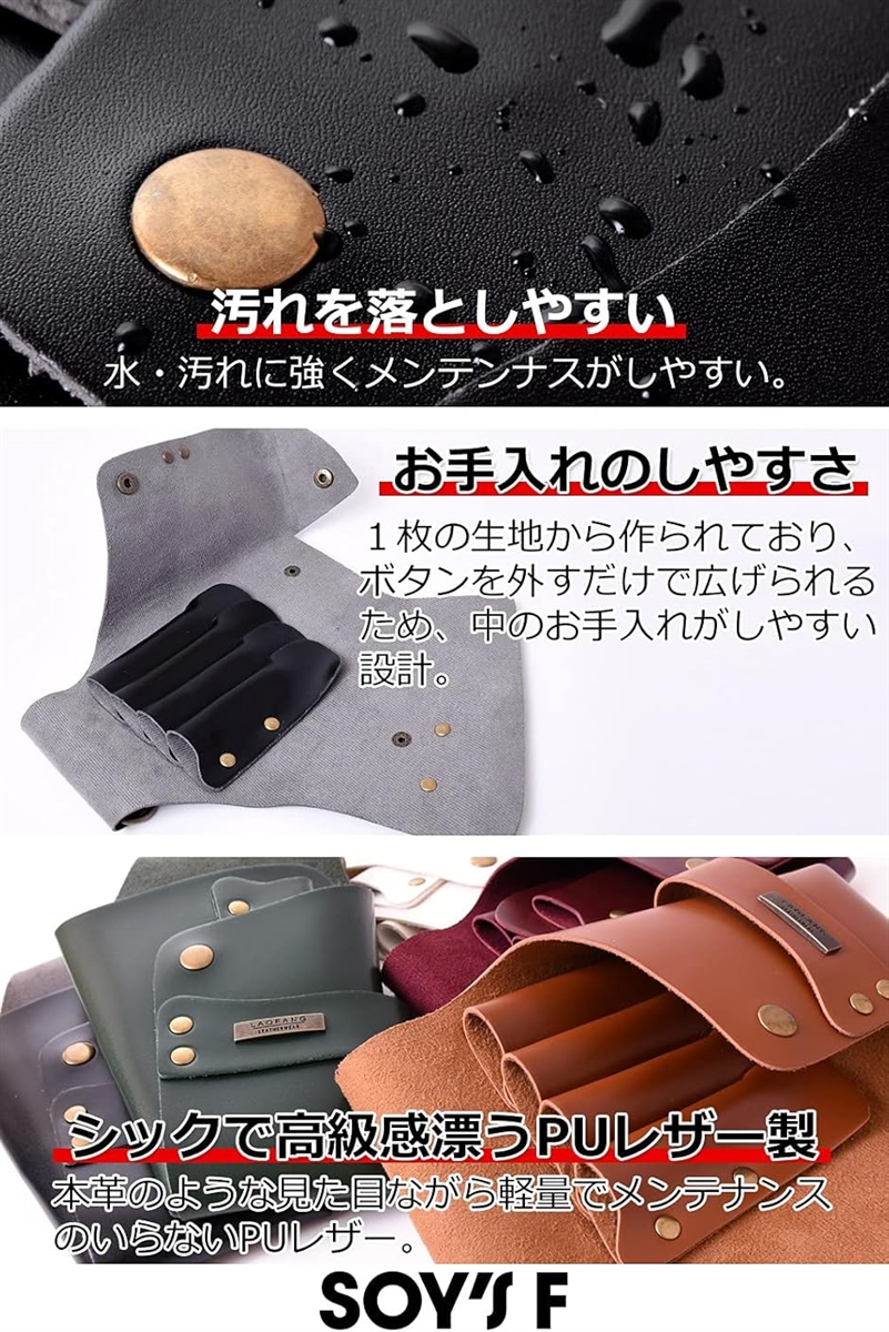 美容師の場合、カラー剤やパーマ液などでシザーケースが汚れることも多いのではないでしょうか?そうした汚れの落としやすさで選ぶなら「SOY’S F」製のシザーケースがおすすめです。