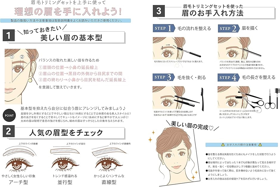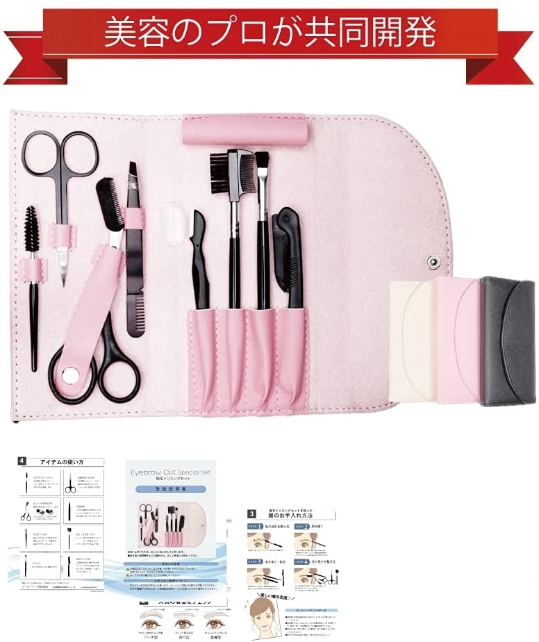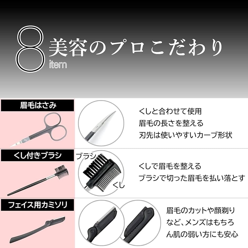 「セット内容」・つくし型コーム・眉毛はさみ・クシ付きはさみ・毛抜き・クシ付きコーム・眉周り口周り用カミソリ・顔毛払い用筆・フェイス用カミソリ・カラーが選べる。専用ケース(3色あり)・理想の眉が見つかるガイド付き(日本語説明書)