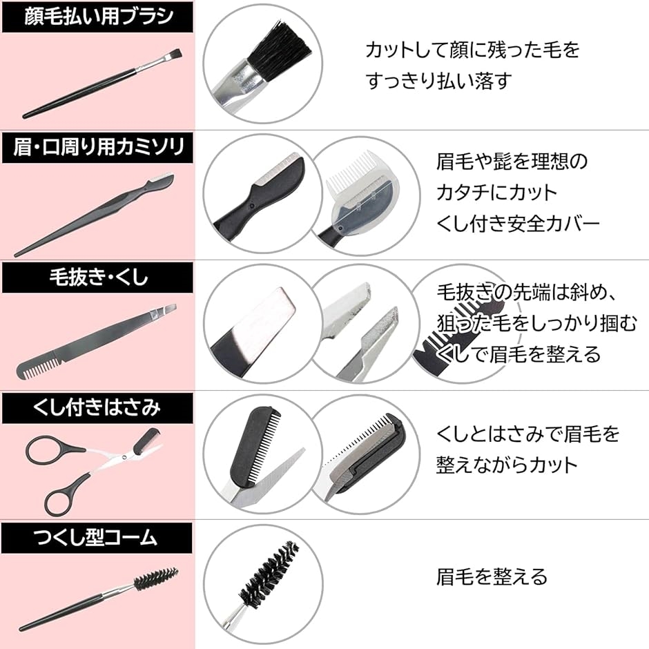 ・「セット内容」 ・つくし型コーム ・眉毛はさみ ・クシ付きはさみ ・毛抜き ・クシ付きコーム ・眉周り口周り用カミソリ ・顔毛払い用筆 ・フェイス用カミソリ ・カラーが選べる。専用ケース(3色あり) ・理想の眉が見つかるガイド付き(日本語説明書)