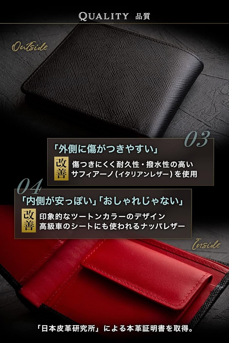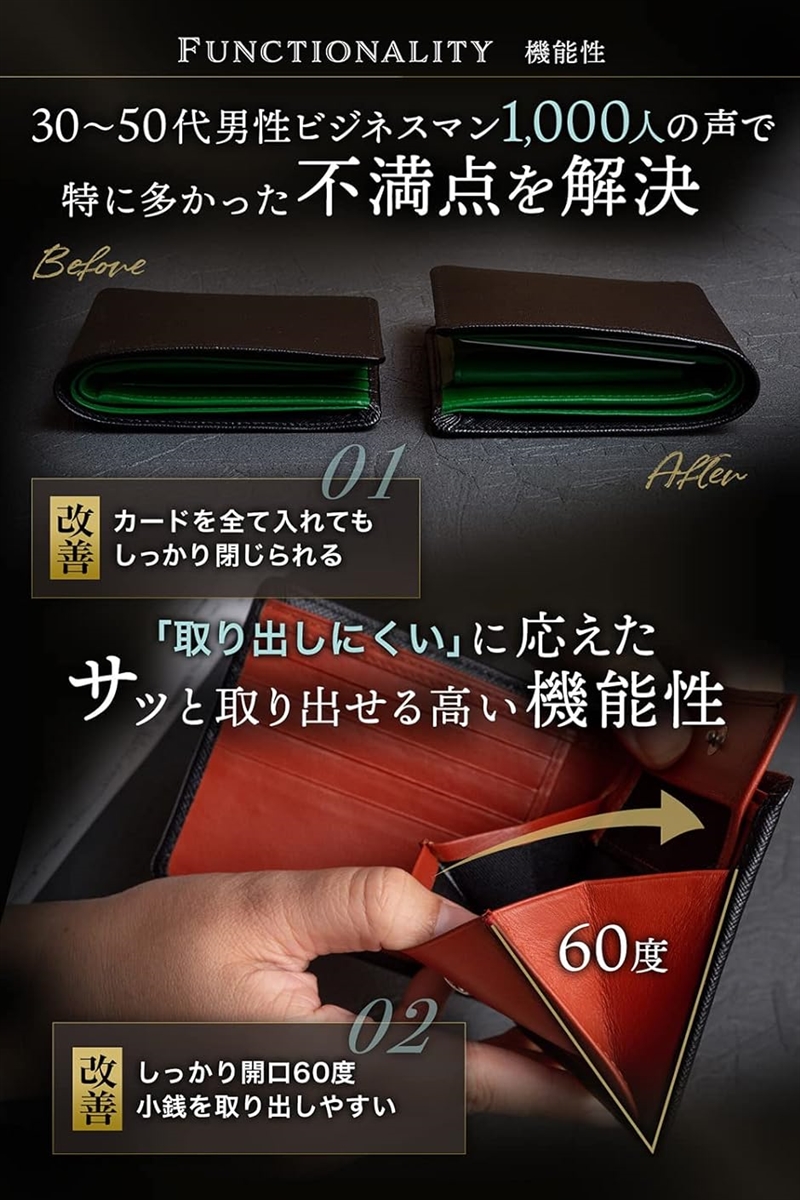 xxアンケート調査に基づく改善ここまでは同タイプの他の商品と同じですが、革師京極では「30〜50代男性ビジネスマン1000人に行ったアンケート調査」に基づいて、二つ折り財布にありがちな不満を解消する3つの工夫を行っています。x