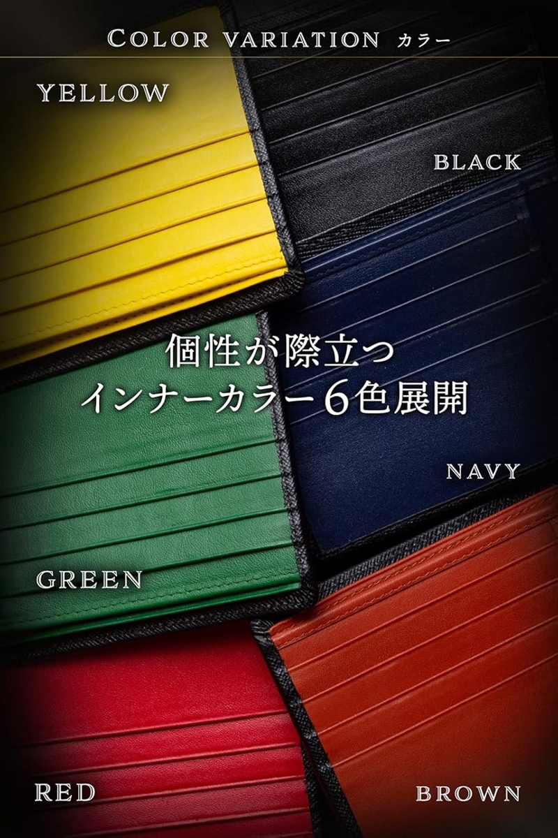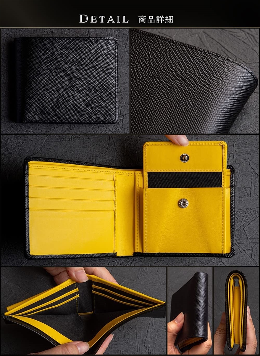 商品詳細「素材」本革(外側:サフィアーノレザー、内側:ナッパレザー)「サイズ」幅11.5cmx高さ9.8cmx厚さ2.0cm「重量」約80g「収納」小銭入れ[1区画]、お札入れ[2区画]、カードポケット[10カ所]xxカラーバリエーション*ブラック*ブラウン*ネイビー*イエロー*グリーン*レッド定番色からビビッドな色まで6色を用意いたしました。