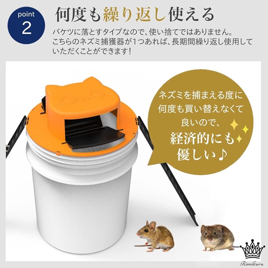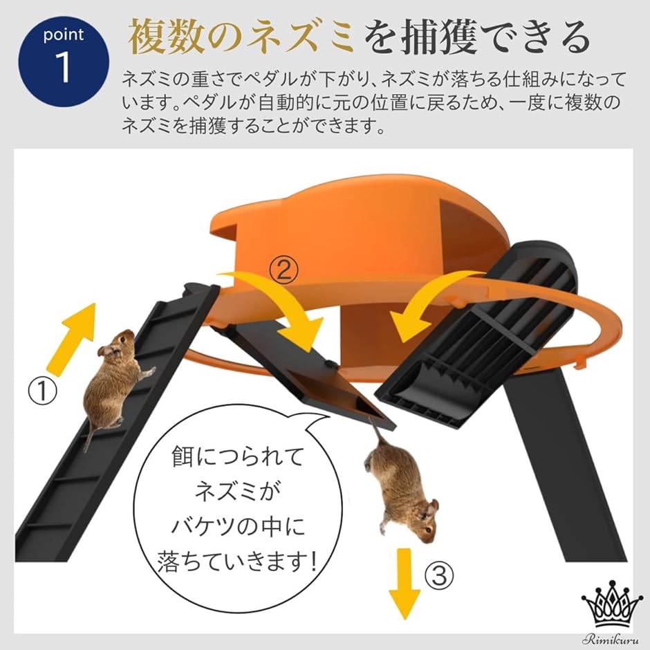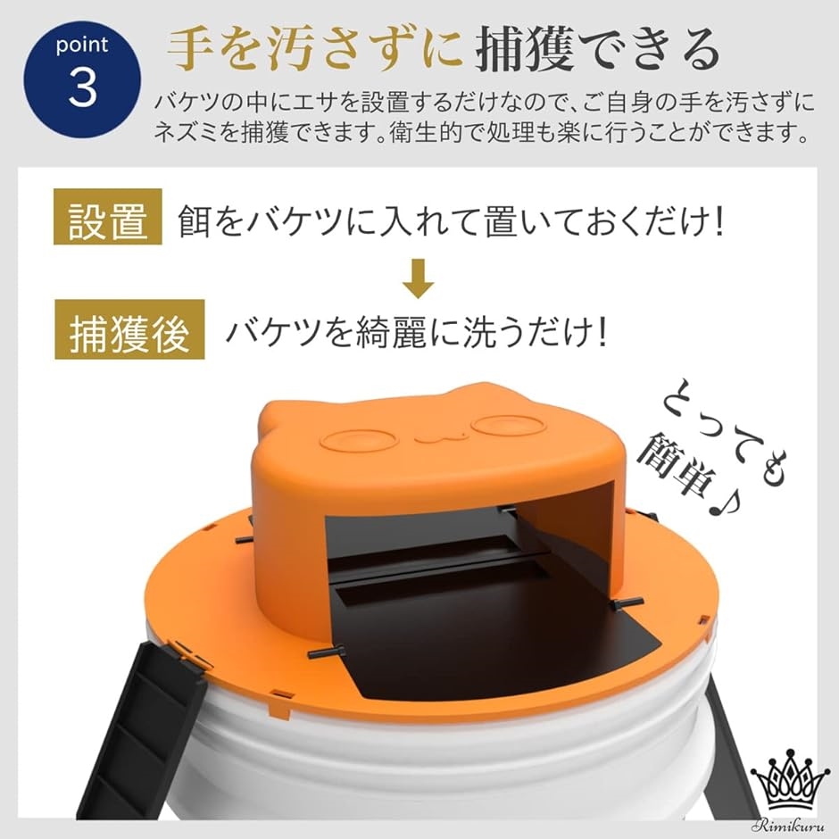 ・手を汚さない高い捕獲能力。:バケツの中にエサを設置するだけでご自身の手を汚さずにネズミを捕獲できるので、衛生的で処理も楽に行うことができます。