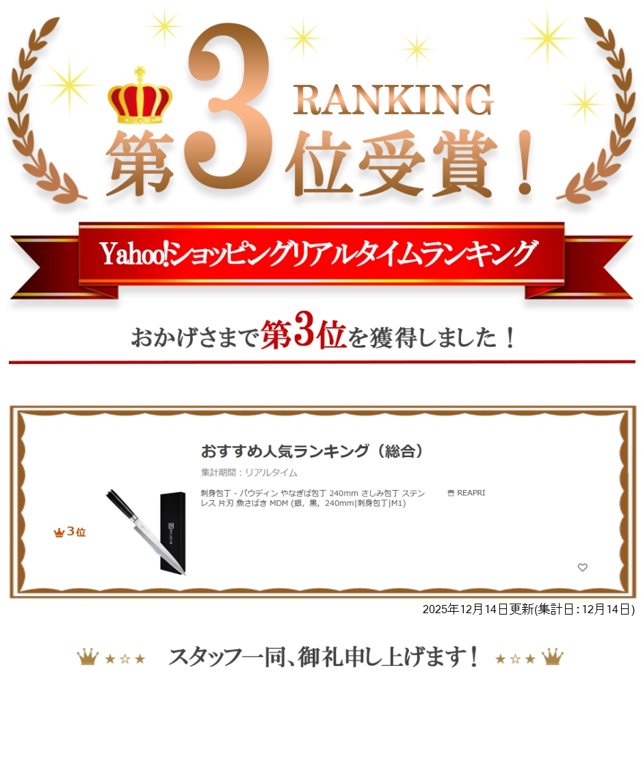 | 商品名 | 刺身包丁 - パウディン やなぎば包丁 240mm さしみ包丁 ステンレス 片刃 魚さばき 三枚おろし 海鮮 マグロ ローストビーフ 切れる包丁 柳刃 |