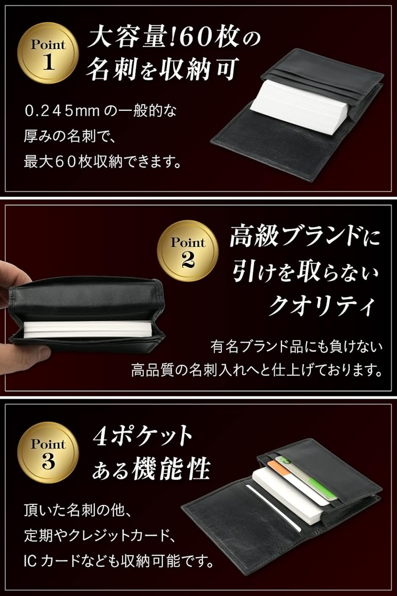 「角折れ対策済み」「最大60枚収納」「安心の4ポケット」使いやすさにもこだわって商品開発いたしました。