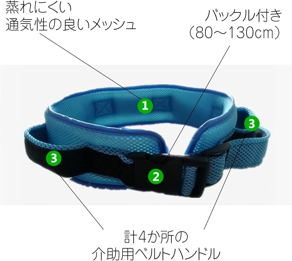 「腰ベルト」長さ80〜130、ベルト幅9cm、介助用ベルトハンドル4か所、表面メッシュ、ウレタン。