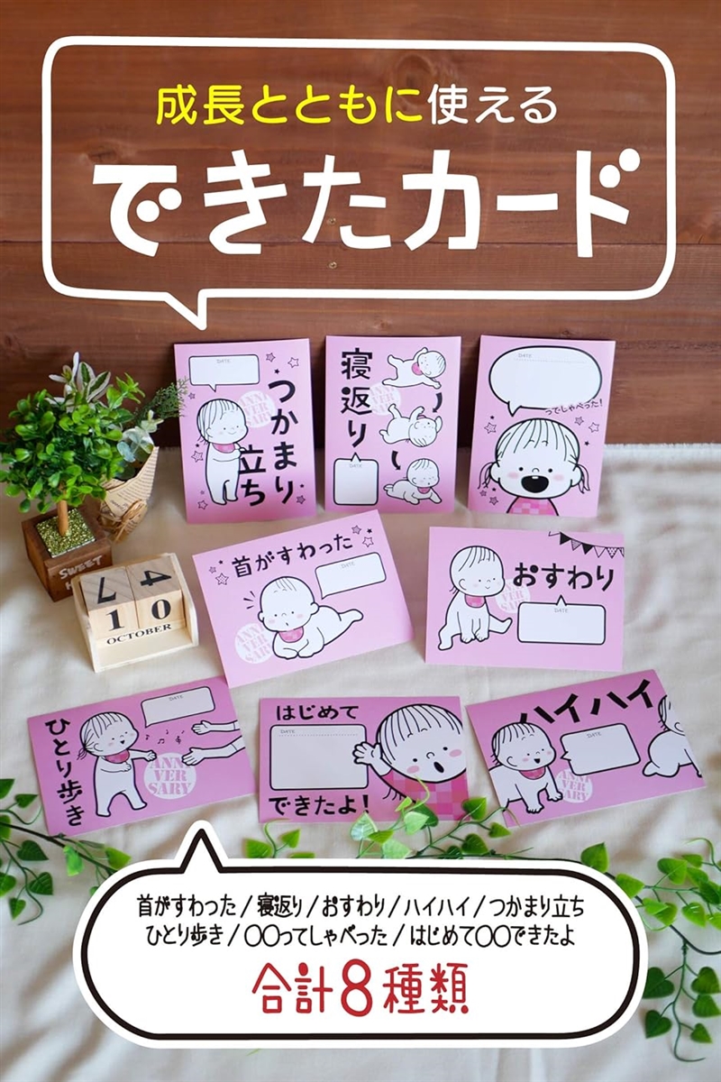 「首がすわった」「寝返り」「おすわり」「ハイハイ」「つかまり立ち」「ひとり歩き」「**ってしゃべった」「はじめて**できたよ」 「できた」カードには日付を入れる欄があるので、後で写真を見た時にいつの出来事かすぐにわかります。