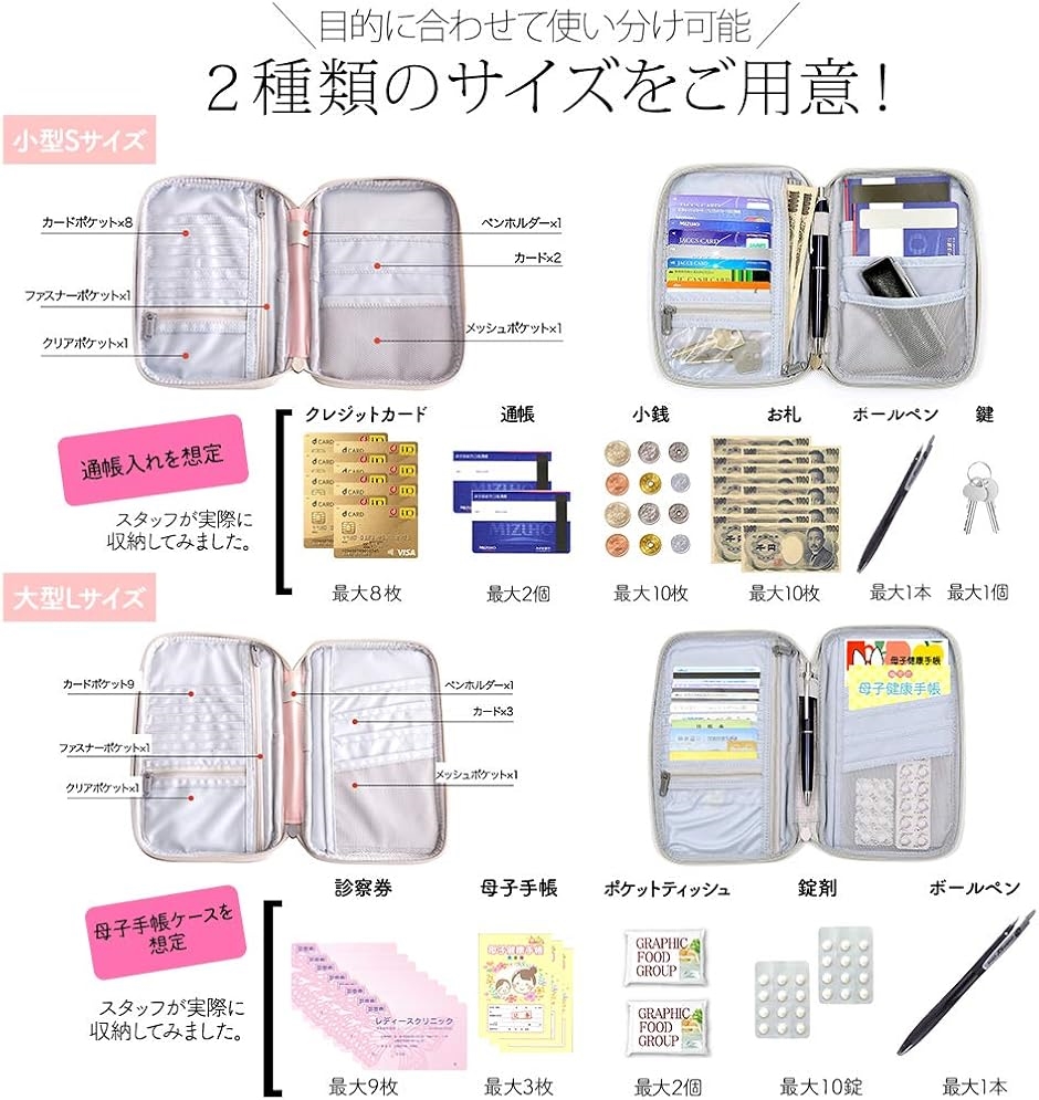 「保険証や診察券、病院からもらう書類などとにかく多く収納して持ち運びたい。」という方は大きなサイズ。 「パスポートや紙幣、小銭だけ少しだけ持ち歩きたい」という方は小さなサイズ。 と持ち物の量やサイズに合わせてご利用いただけます。