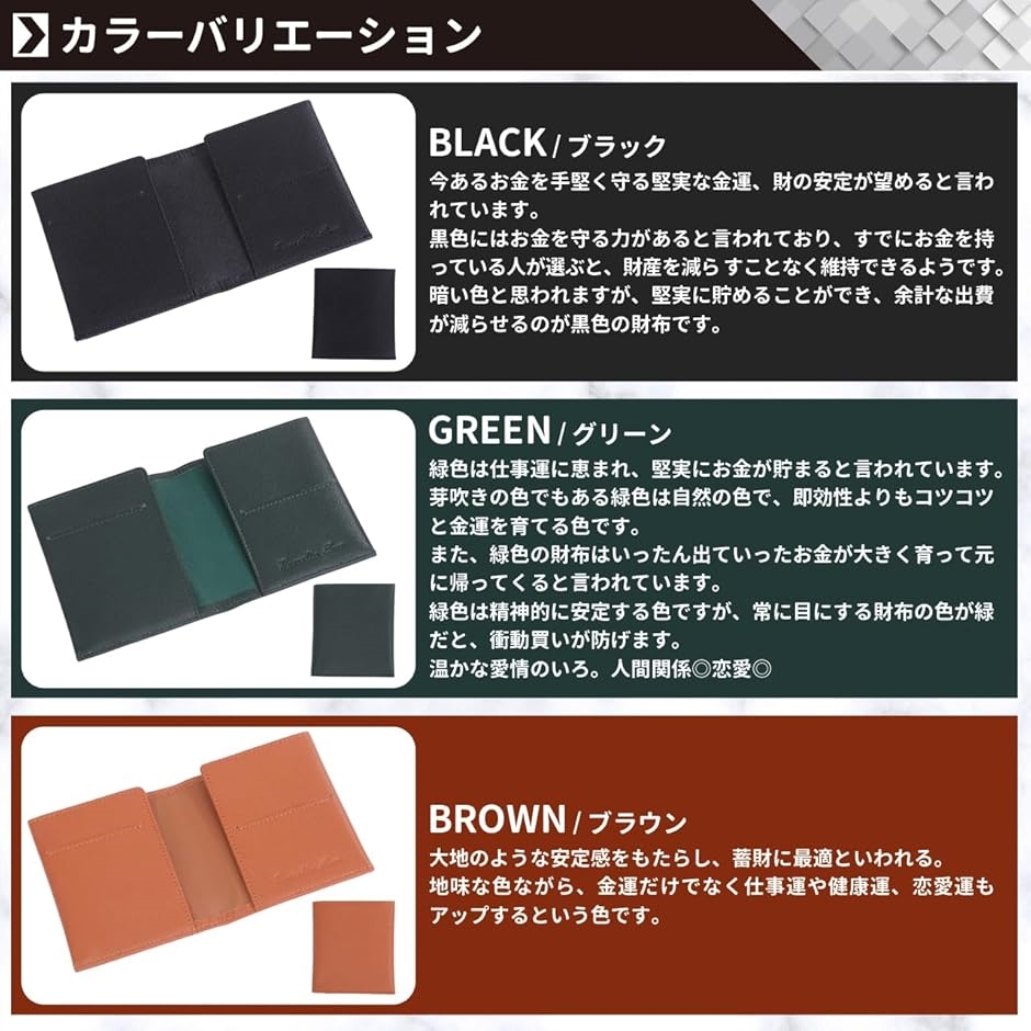 「カラー」ブラック、グリーン、ブラウン 「ブラック」・・今あるお金を手堅く守る堅実な金運、財の安定が望めると言われています。