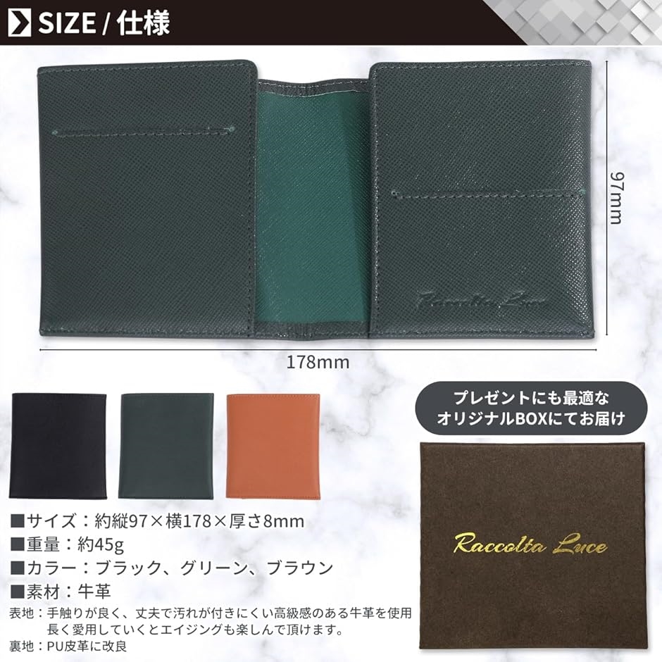 汚れが付きにくく、傷がつきにくい素材を採用 「サイズ」約 縦97 x 横178 x 厚さ8mm/重量:約45g 「仕様」お札入れx1、カードポケットx2 オリジナルの化粧箱にいれてお届けしますのでプレゼントにも。