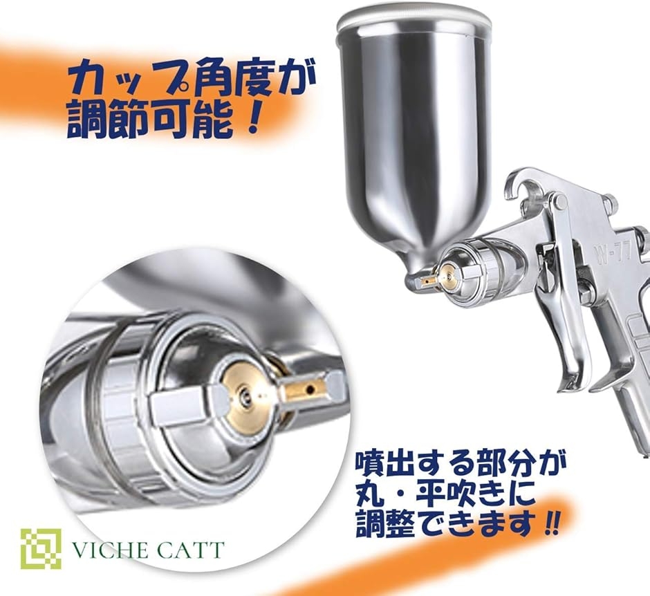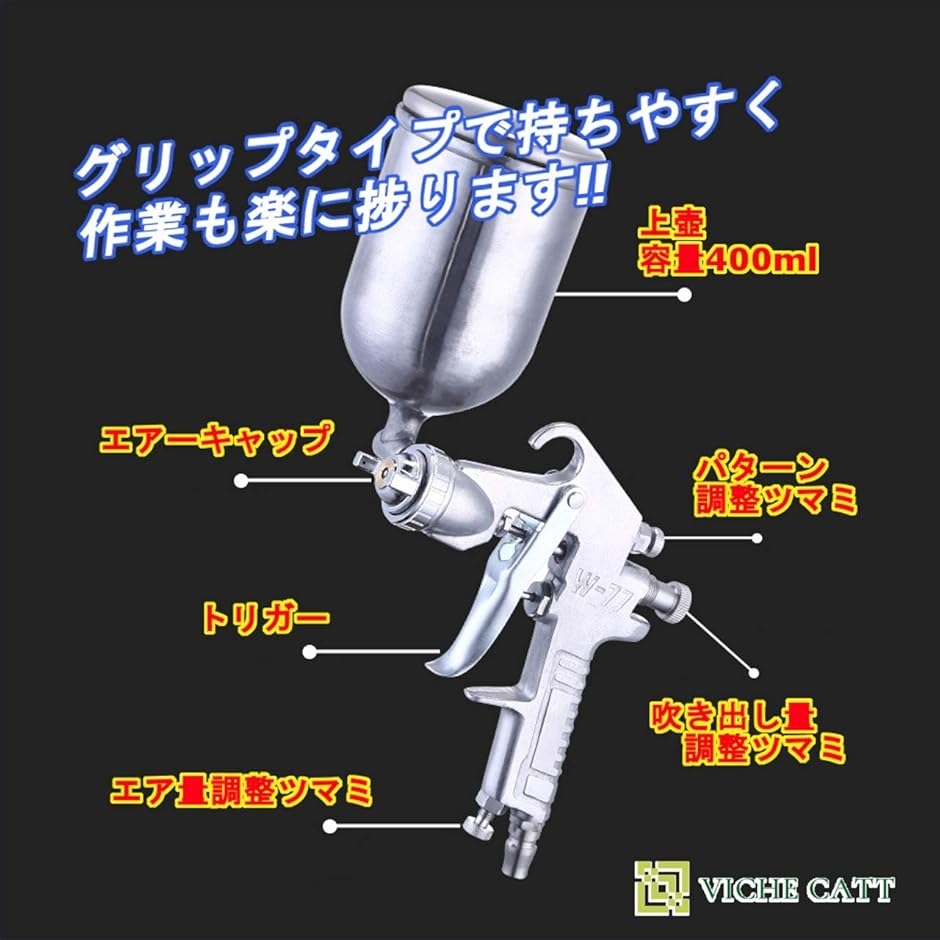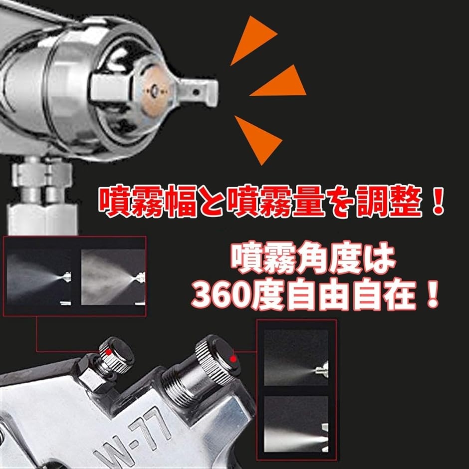 | 商品名 | エアー ペイント スプレーガン 吸上式 W-77 重力式 口径 2.0 2.5 3.0 mm タンク容量 400ml 上壺式 ステンレス鋼 塗装 工具 3.0口径 |