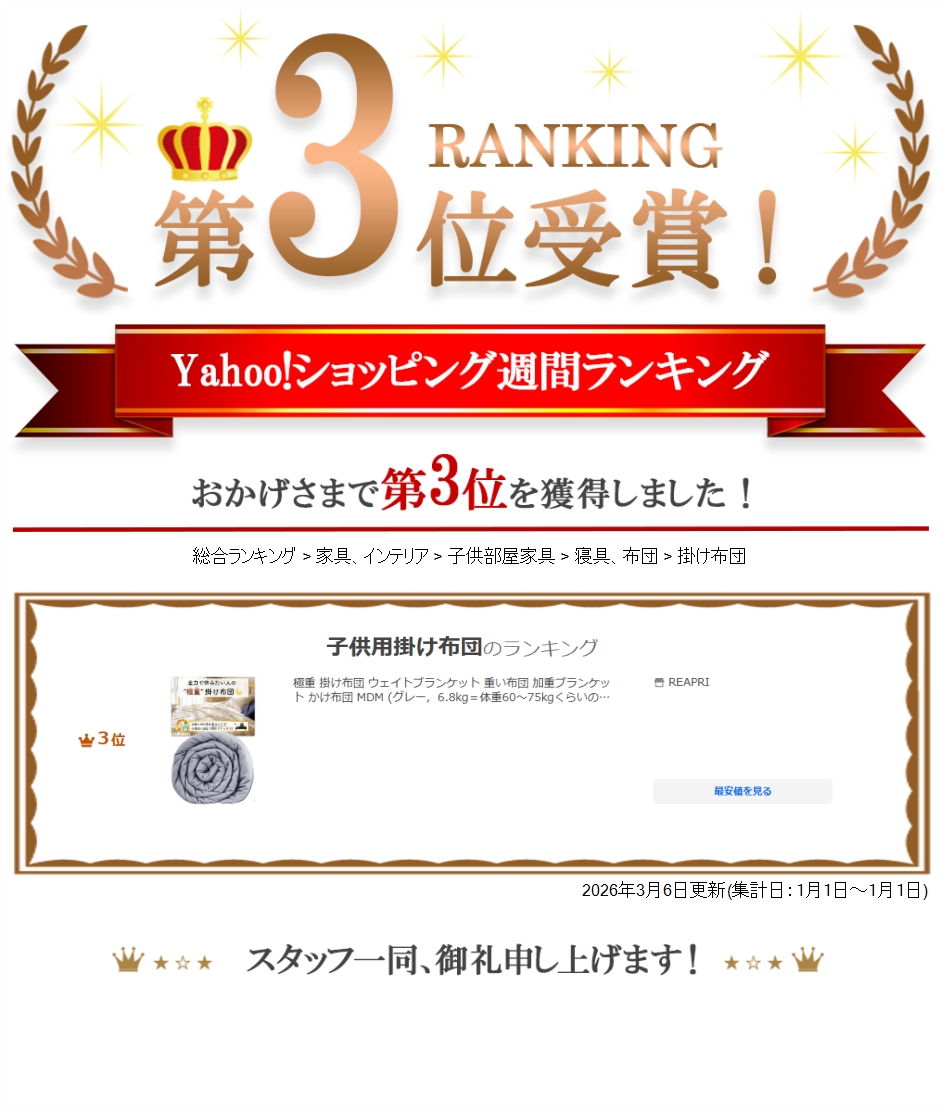 「素材」表面:コットン、中綿:ポリエステル、プレミアムガラスビーズ 「適切な重さ」「体重60〜75kgくらいの方は6.8kgのブランケット」「体重45〜60kgくらいの方は5.4kgのブランケット」「体重35〜50kgくらいの方は4.5kgのブランケット」「体重20〜35kgくらいの方は3kgのブランケット」が心地良さを感じやすいです。