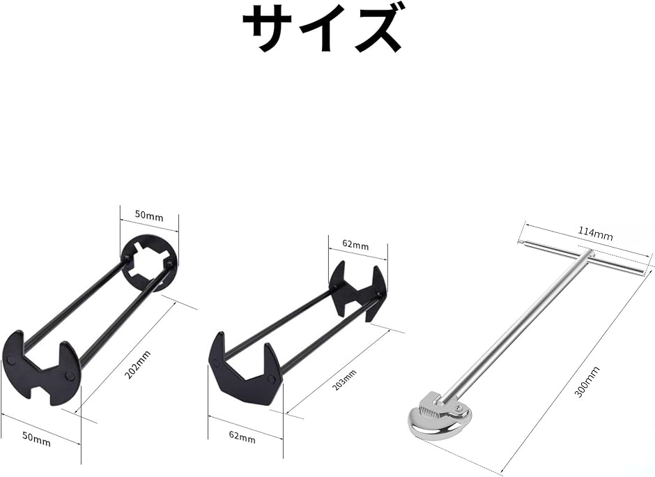 頑丈なレンチや滑り止めハンドルが装備され、キッチンシンクや洗面台、浴槽の修理から蛇口交換、配管工事まで様々な水道メンテナンス作業をサポートします。