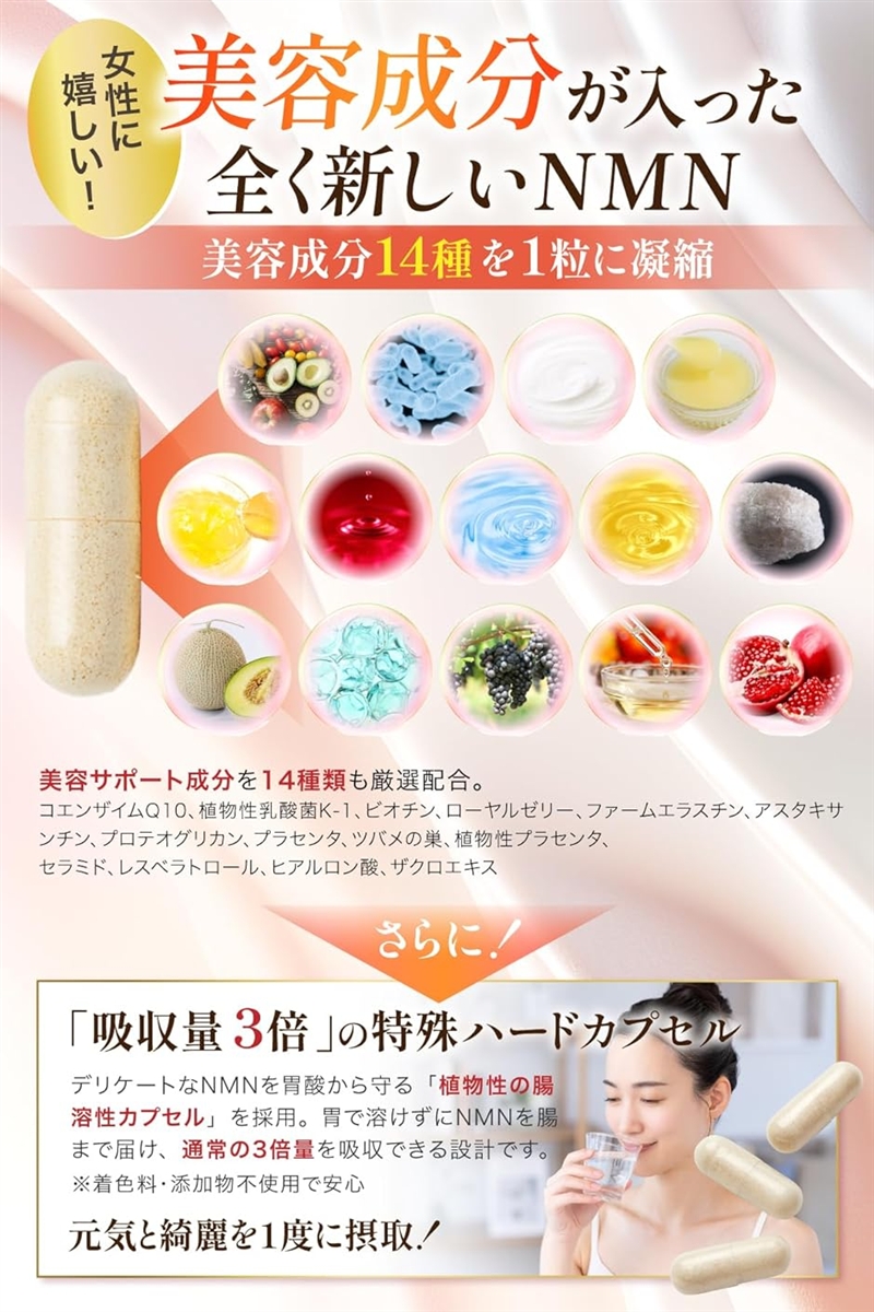 ですが、NMNが効果を発揮するという1日200mgという量には、遠く及びません。