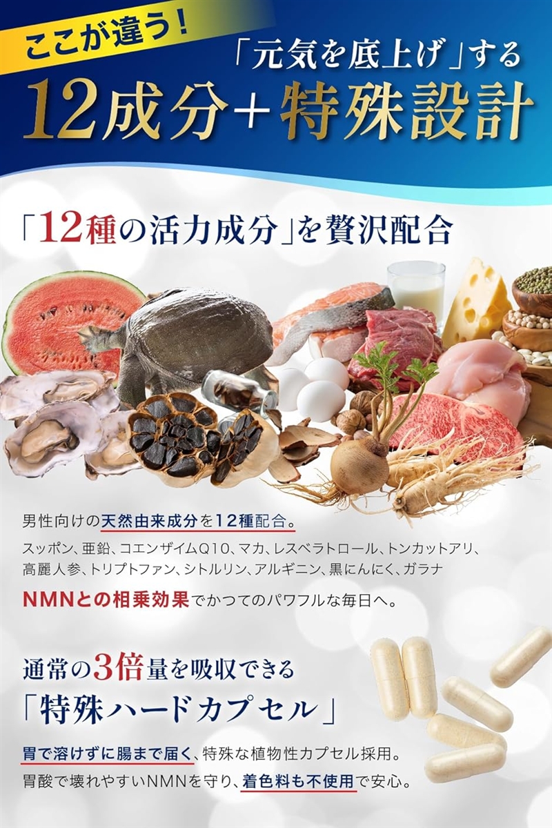 | 商品名 | NMN サプリメント 15000mg 国内産 β-NMN 高年 男性用 高純度100% マカ 亜鉛 すっぽん 耐酸性カプセル |