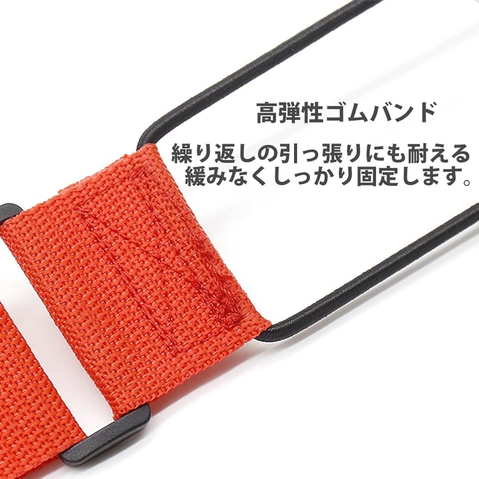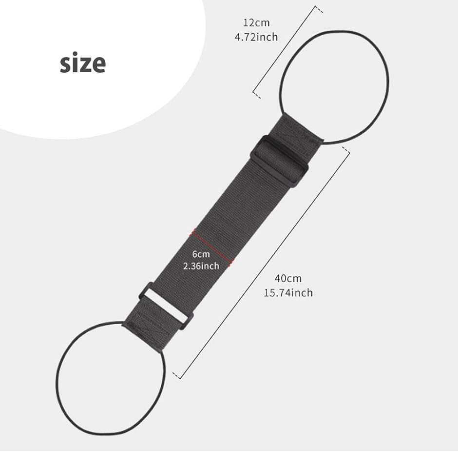 ベルト部長さ約26〜40cm(の間で調整可能)、幅約6cm、ゴム部:直径約12 cm、ゴム部込みの全長約50〜64cm。
