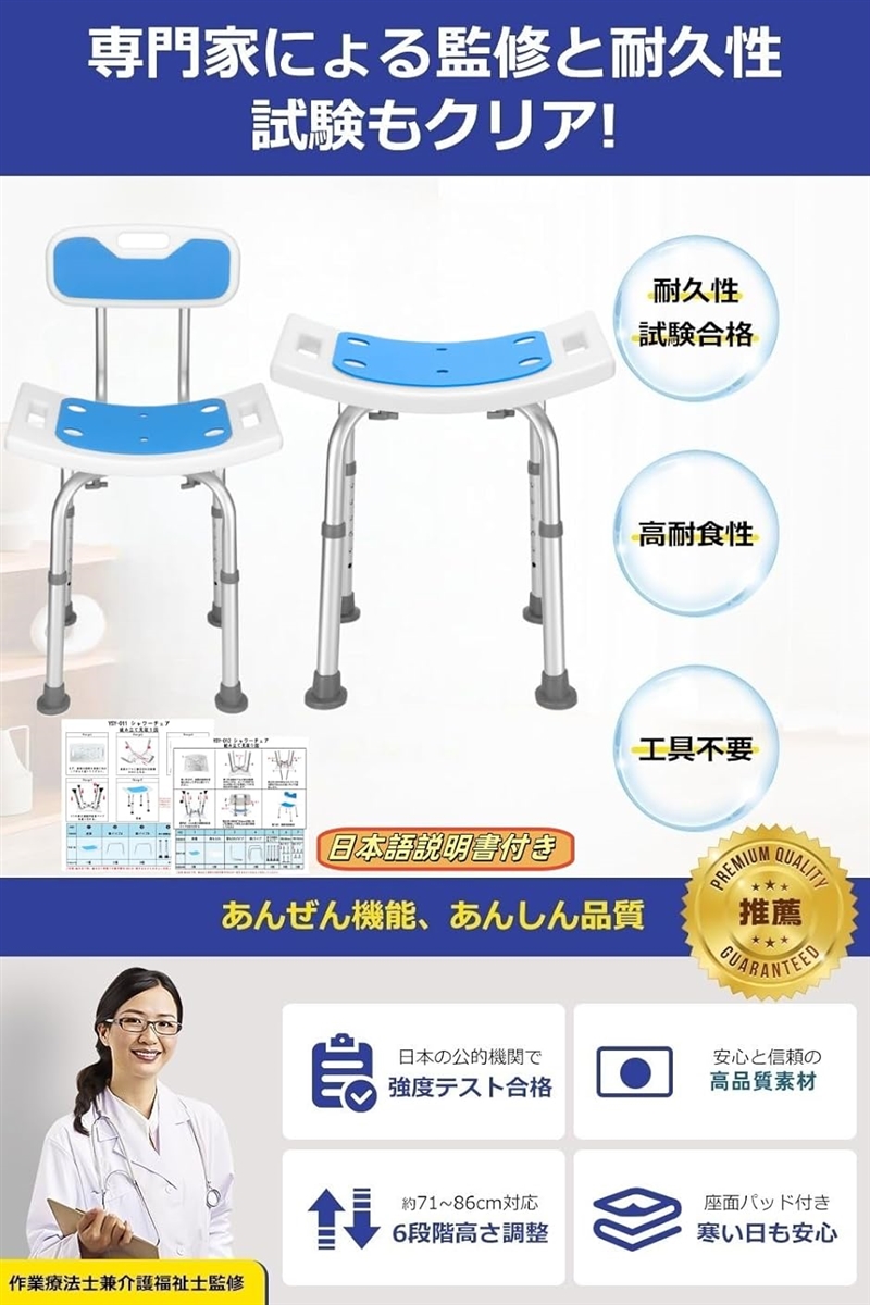 | 商品名 | シャワーチェア 日本理学療法士共同監修介護椅子 お風呂椅子 介護用 6段階高さ調節 バスチェア アルミ合金製 軽量 丈夫 浴室 椅子 介護 耐荷重150kg |