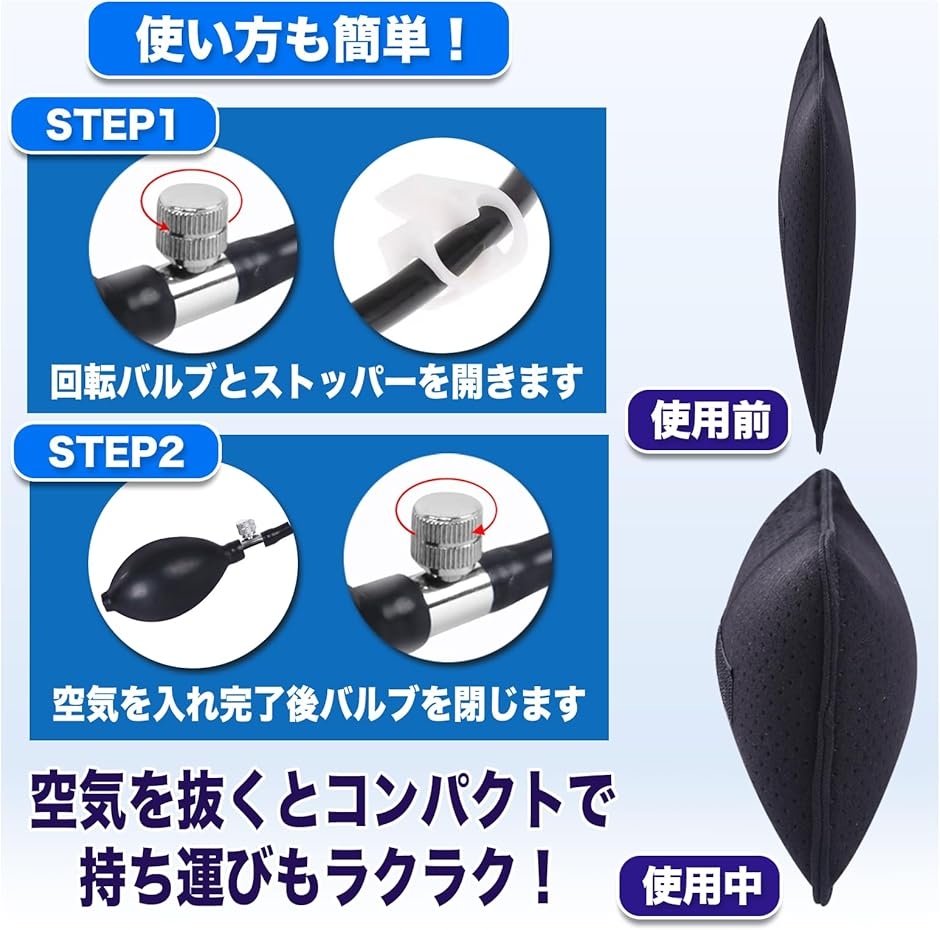 「インフレータブルデザイン」このクッションは簡単に空気を入れたり抜いたりできるため、使用者の好みに合わせた硬さに調整可能です。