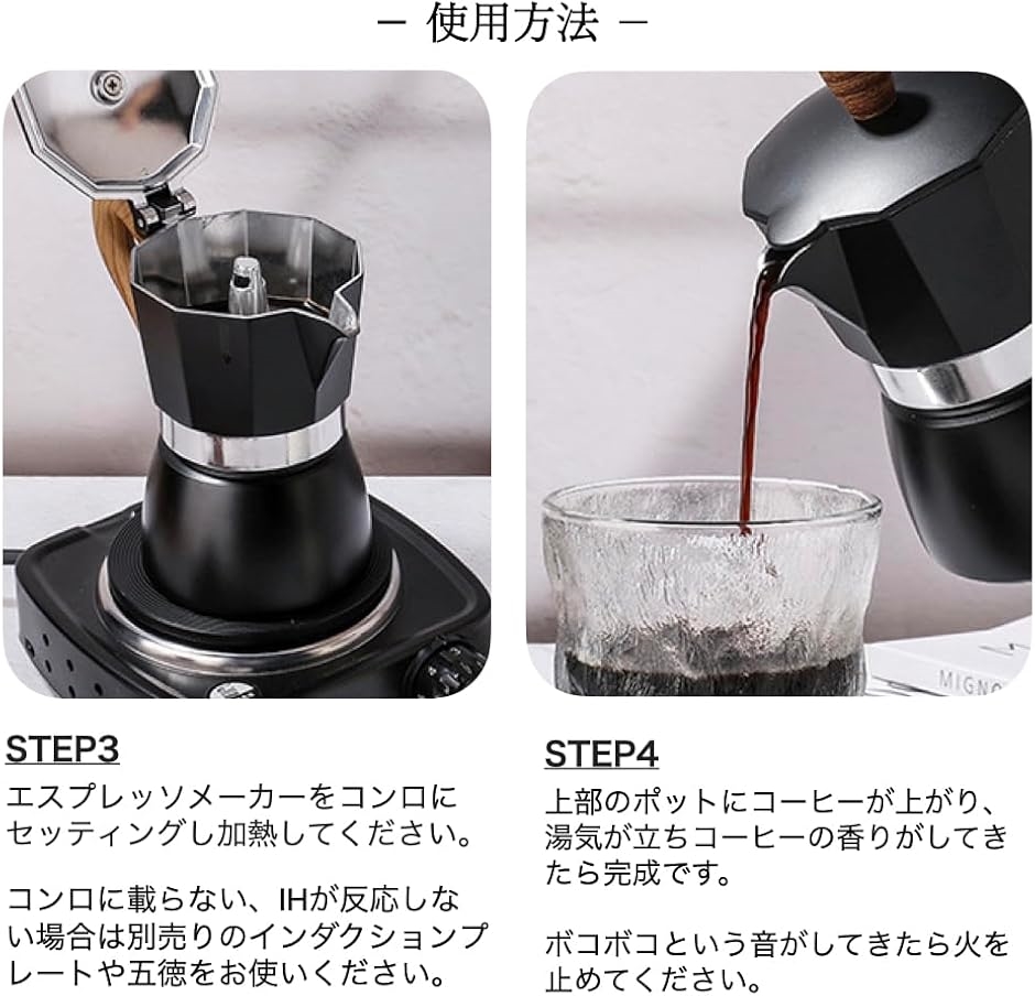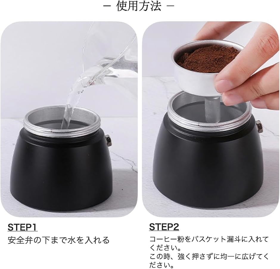 | 商品名 | エスプレッソメーカー 直火式 IH対応 ガスコンロ 3カップ 3杯 150ml マキネッタ モカポット アウトドア キャンプ 小型 小さい 日本語説明書付き ブラック 3カップ 150ml |