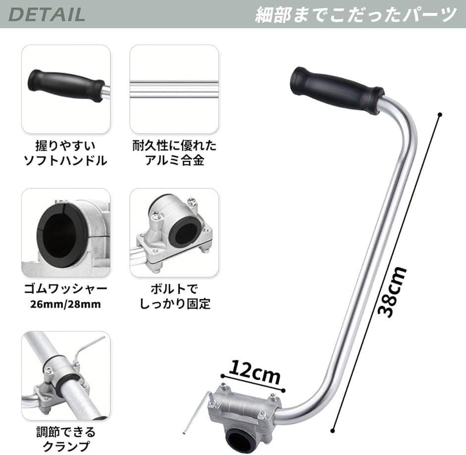 「商品仕様」素材:アルミ合金、ハンドルバー:約38cm、クランプ:幅約12cm、ゴムワッシャー:26mm/28mm「セット内容」ハンドルバー、ゴムワッシャーx2、クランプx1、ボルトx6、六角レンチ