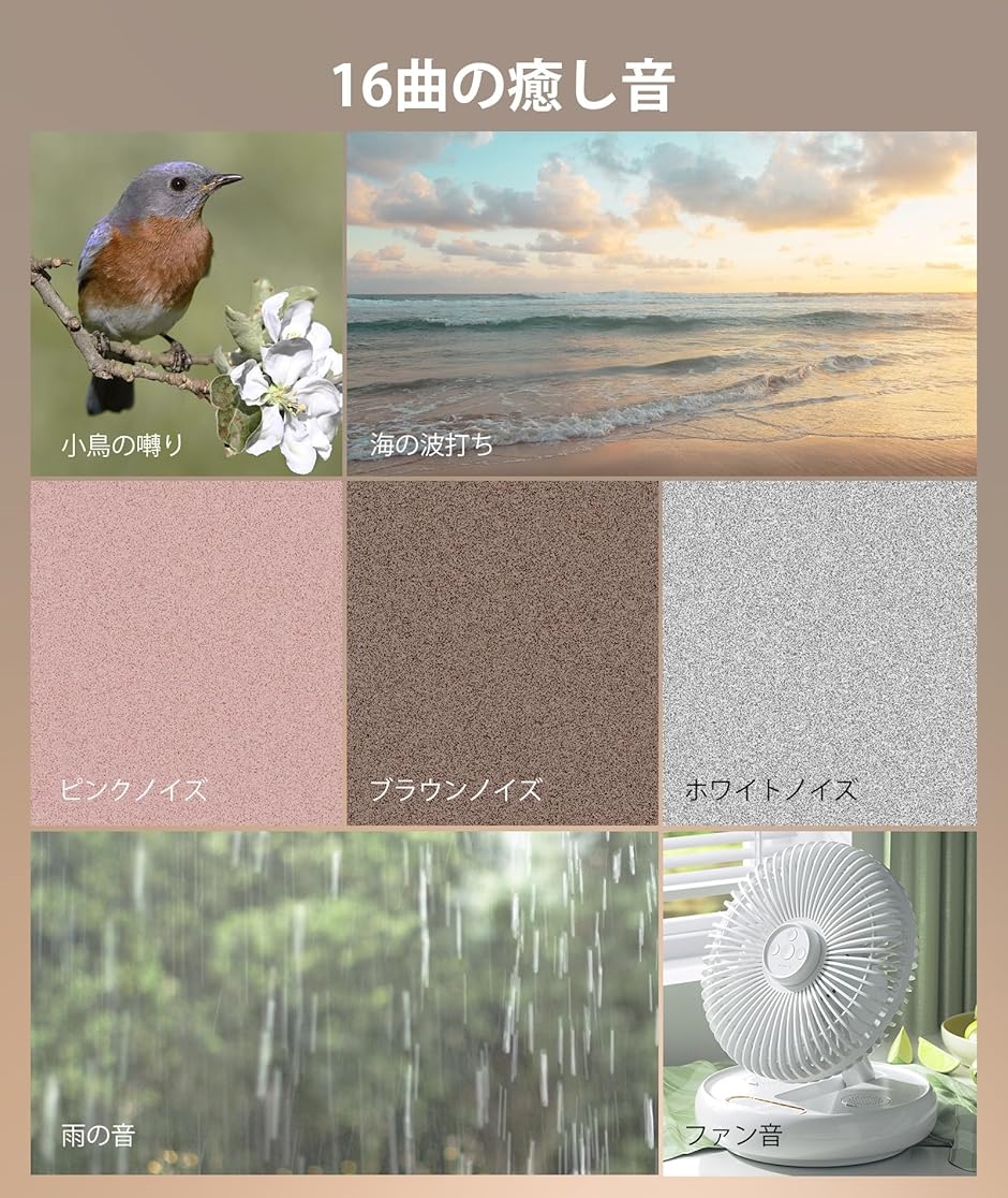 「16種類の癒やしサウンドを収録」睡眠にリラックスできる小鳥の囀り、海の波打ち、川のせせらぎ、雨の音、篝火の音、虫の鳴き声、春の雨など7種類の自然音)が用意し、赤ちゃんの向け音(睡眠オルゴール、シューベルトの子守唄、「すーすー」の音)が収録され、集中力アップに効果のあるホワイトノイズとファン音も3曲別々備えています。