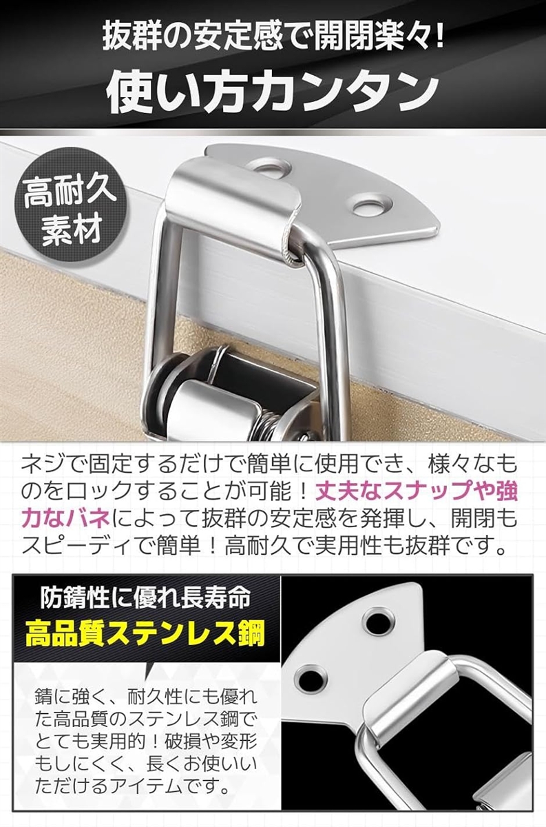 「使い方カンタン」ネジで固定するだけで簡単に使用でき、様々なものをロックすることが可能。丈夫なスナップや強力なバネによって抜群の安定感を発揮し、開閉もスピーディで簡単。高耐久で実用性も抜群です。