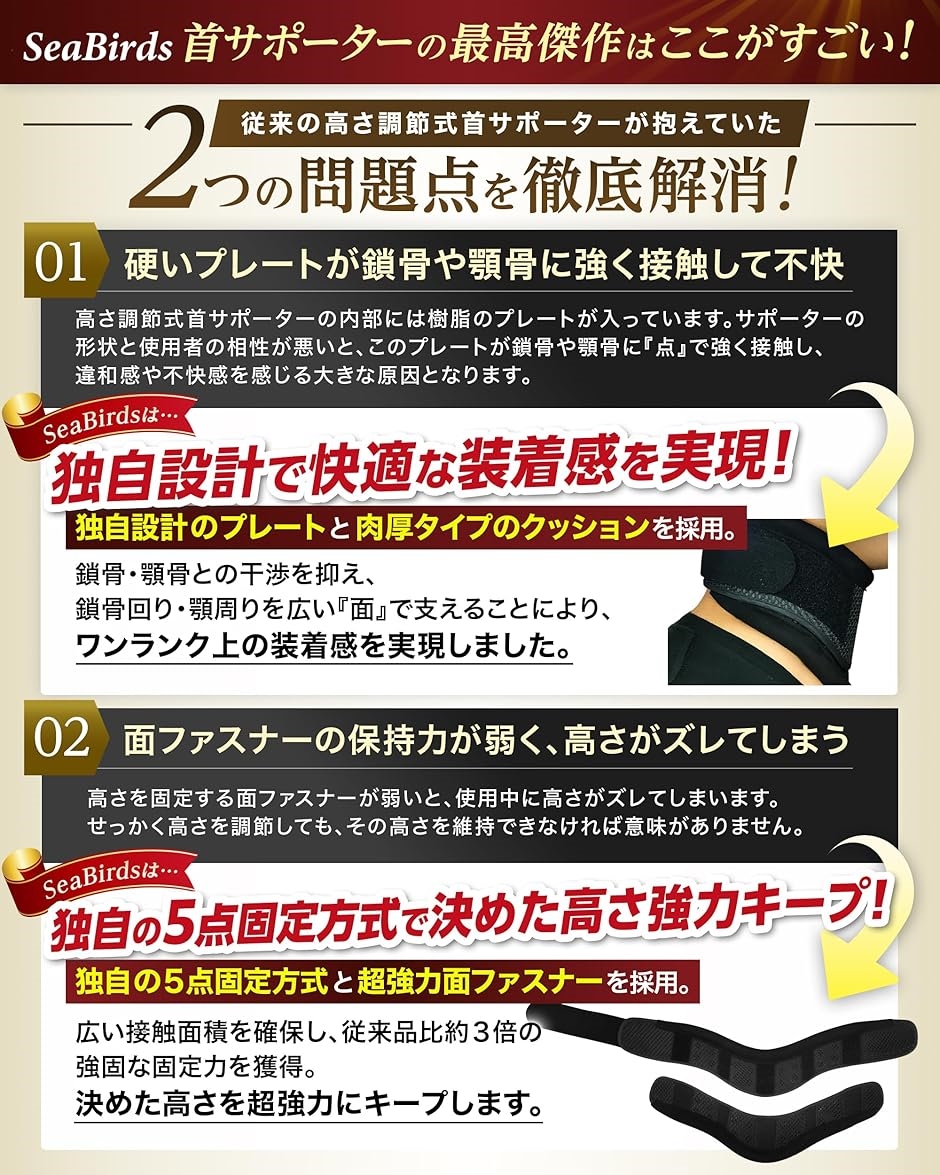 「SeaBirds首サポーターはここがすごい」 (1)前作(PREMIUM版)から更に進化した新開発プレートと肉厚クッションの採用により、鎖骨・顎骨との干渉を抑え、より快適な装着感を実現しました。