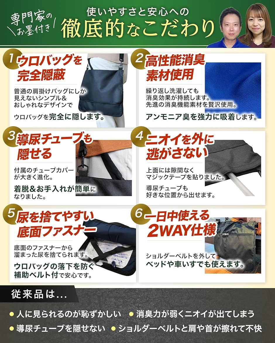 「人目もニオイも気にせずに、自信あふれる自由な毎日へ。」 (1)普通のショルダーバッグのような洗練された外観で、ウロバッグと導尿チューブを自然かつおしゃれに隠します。