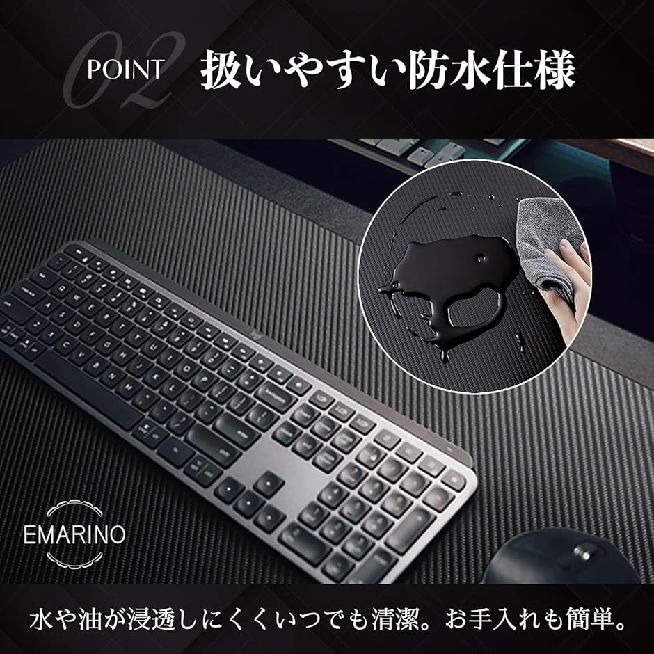 「デスク環境をCoolにデザイン」 ガジェット系アイテムへ関心がある方、デスク周りのアップグレードに興味を持たれている方、coolで落ち着いたデスク環境を好む方などに人気のカーボン調にデザインされたデスクマットです。