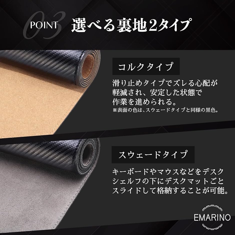 スウェードタイプはキーボードやマウスをデスクシェルフの下にデスクマットごとスライドして格納する際に便利。