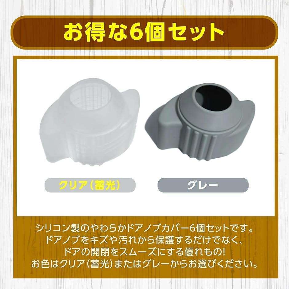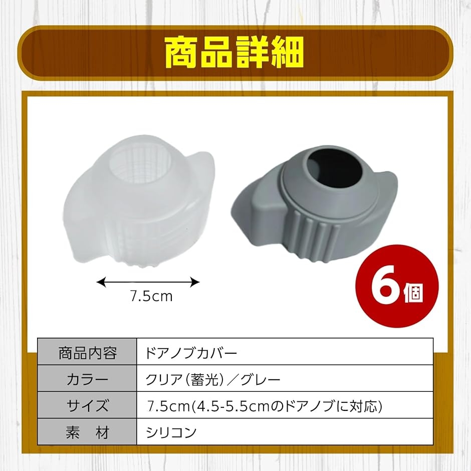 「商品内容」ドアノブカバー「セット内容」6個「カラー」クリア(蓄光)/グレー 「サイズ」7.5cm(4.5-5.5cmのドアノブに対応)「素材」シリコン *モニターの環境により、色の見え方に若干差が生じる場合がございます。