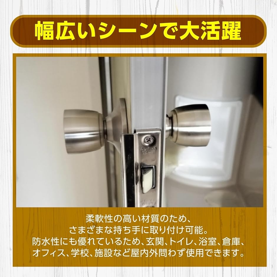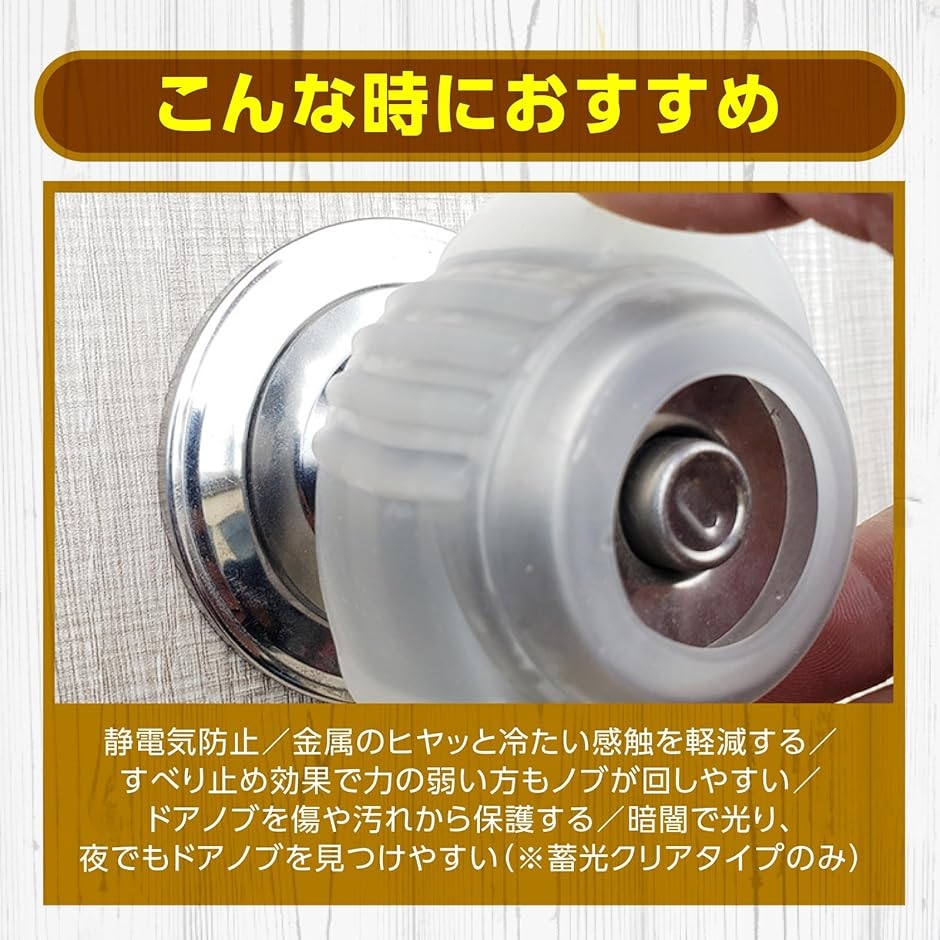 「こんな時におすすめ」静電気防止/金属のヒヤッと冷たい感触を軽減する/すべり止め効果で力の弱い方もノブが回しやすい/ドアノブを傷や汚れから保護する/暗闇で光り、夜でもドアノブを見つけやすい(*蓄光クリアタイプのみ)