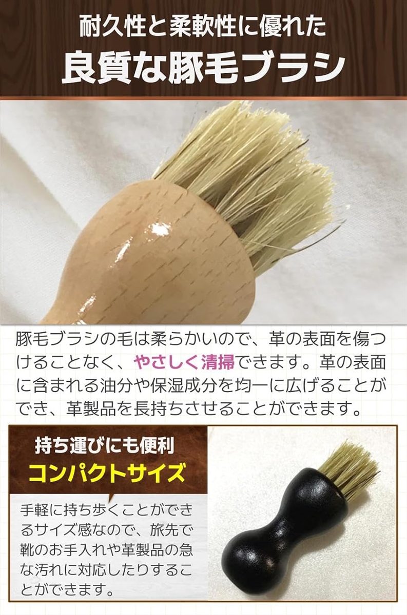 「良質な豚毛ブラシ」豚毛ブラシの毛は柔らかいので、革の表面を傷つけることなく、やさしく清掃できます。