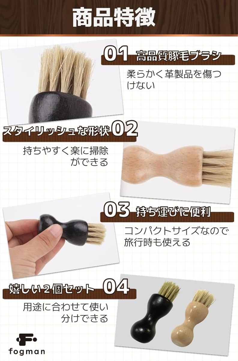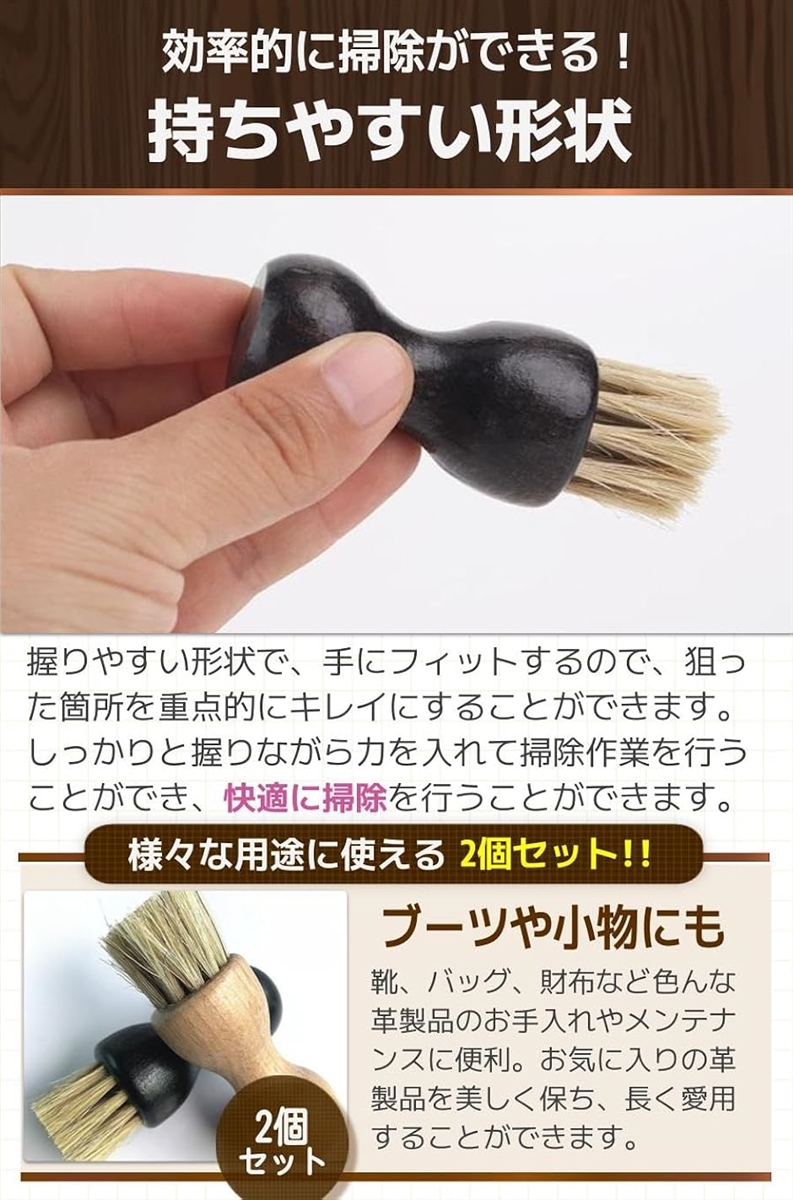 「商品特徴」(1)高品質豚毛ブラシ:柔らかく革製品を傷つけない/(2)スタイリッシュな形状:持ちやすく楽に掃除ができる/(3)持ち運びに便利:コンパクトサイズなので旅行時も使える/(4)嬉しい2個セット:用途に合わせて使い分けできる