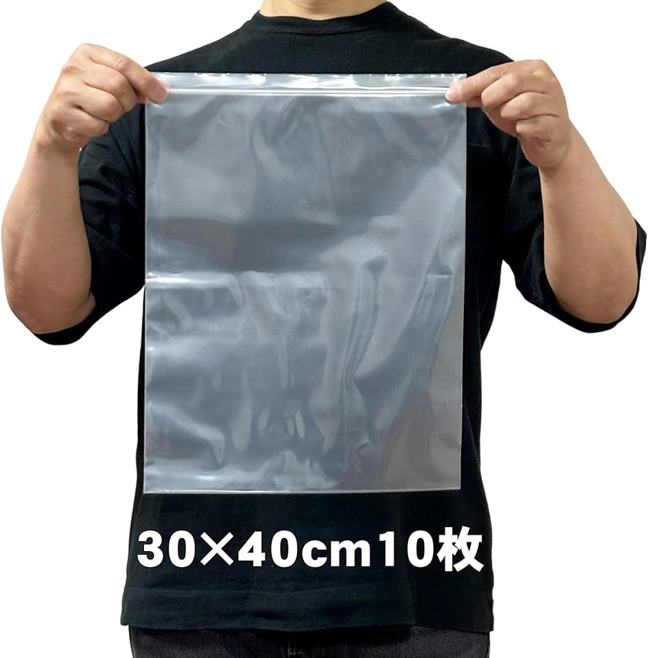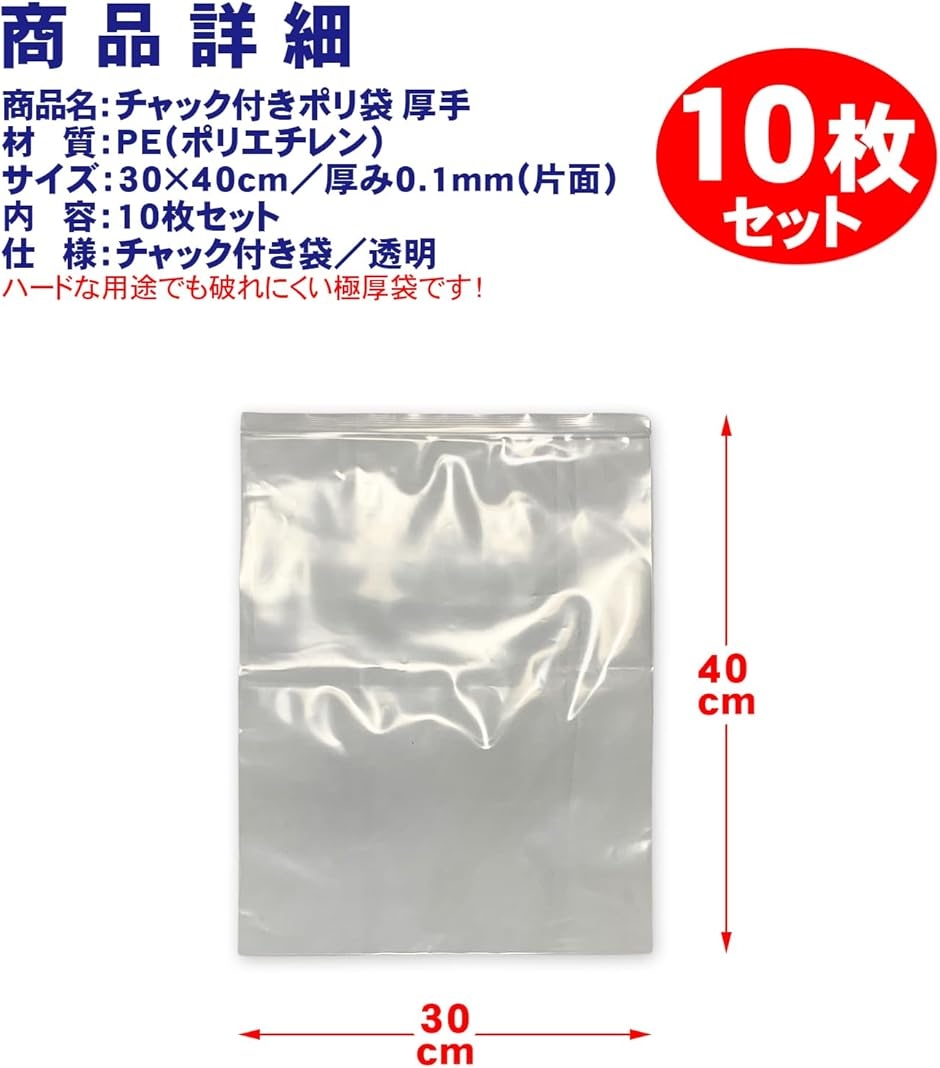 商品名:TOMOTHYチャック付きポリ袋 厚手 素材:PE(ポリエチレン) サイズ:30x40cm 厚さ:0.1mm(両面で0.2mm) 枚数:10枚入り(中国製)
