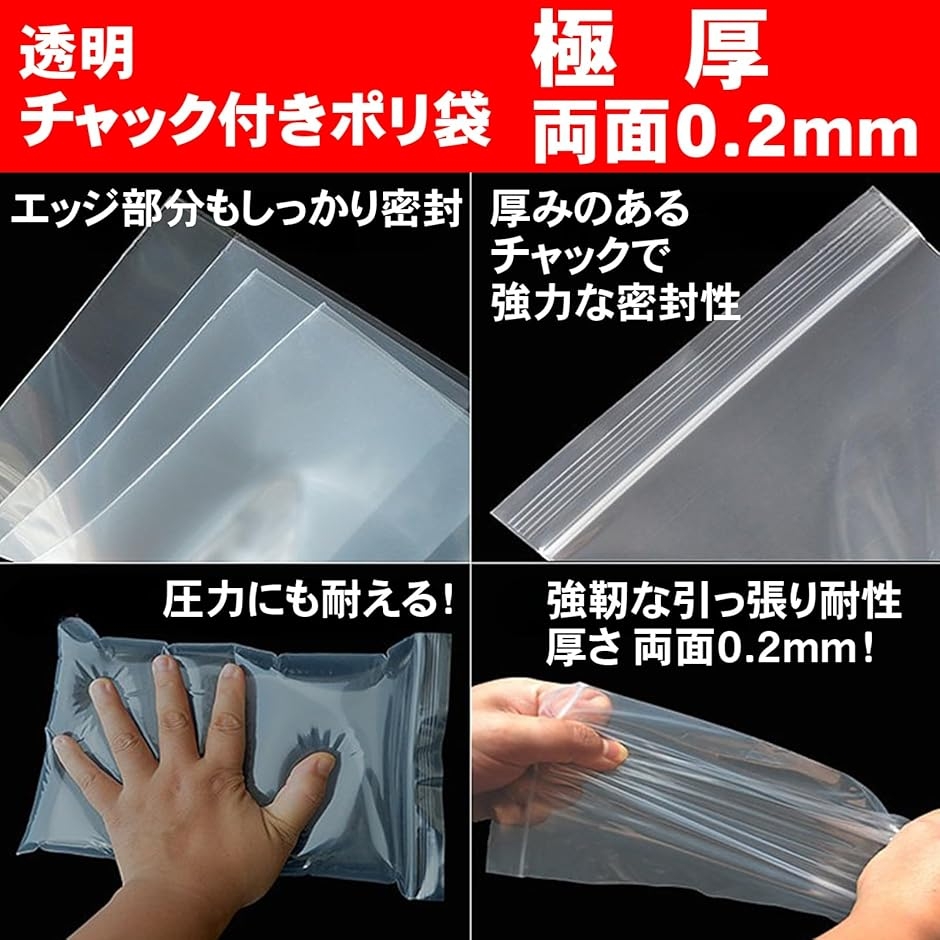 丈夫さと使いやすさを兼ね備えた、極厚両面0.2mm(片面0.1mm)のチャック付き透明ポリ袋。