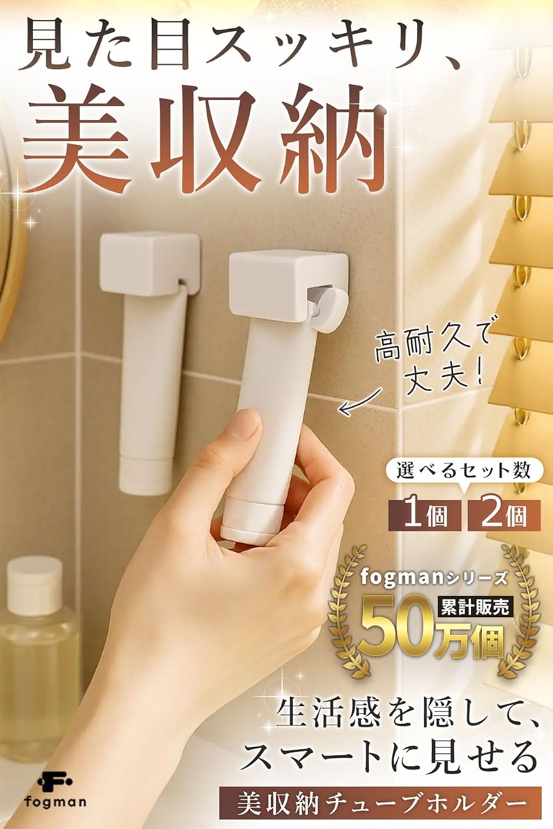 「壁掛けフック式」壁やタイル・ガラスなどに穴を開けずに取り付けできる設計となっており、実用性抜群。壁掛けだけでなく、置き型としてもOK。
