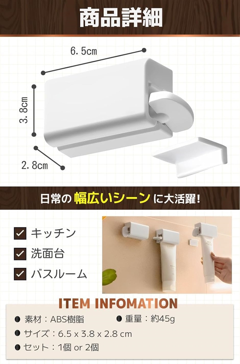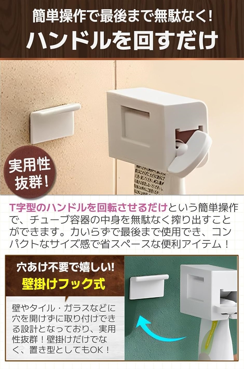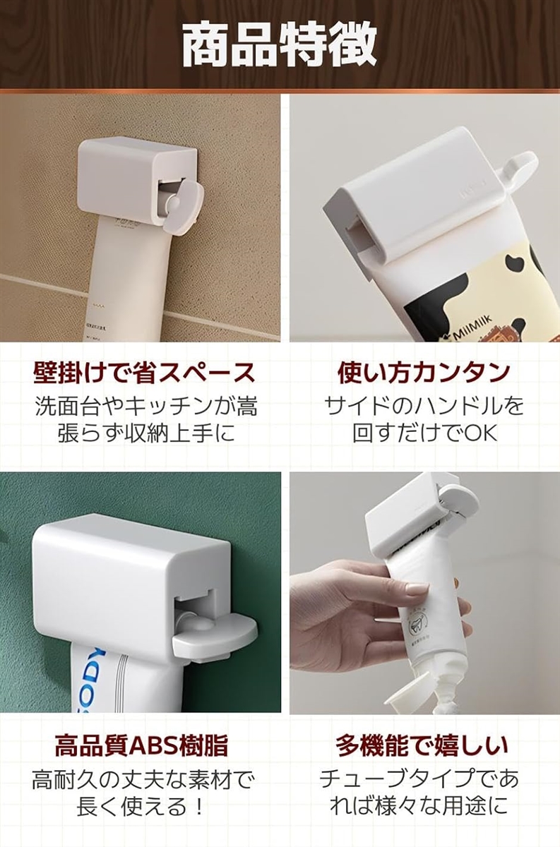 「商品特徴」(1)壁掛けで省スペース:洗面台やキッチンが嵩張らず収納上手に/(2)使い方カンタン:サイドのハンドルを回すだけでOK/(3)高品質ABS樹脂:高耐久の丈夫な素材で長く使える。/(4)多機能で嬉しい:チューブタイプであれば様々な用途に