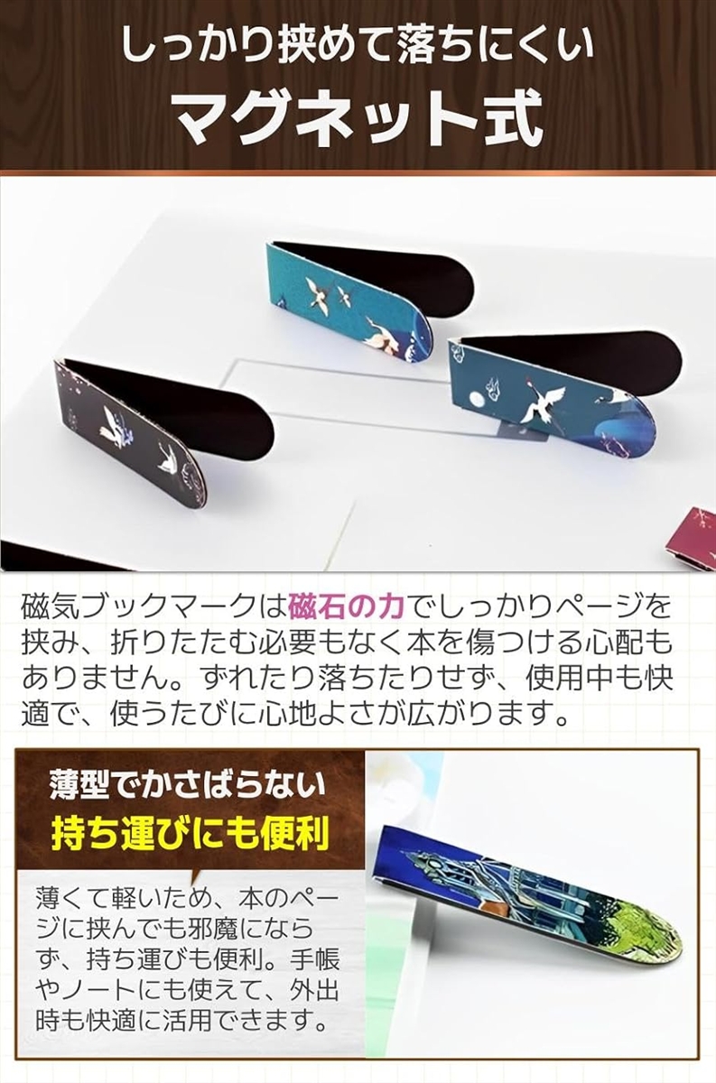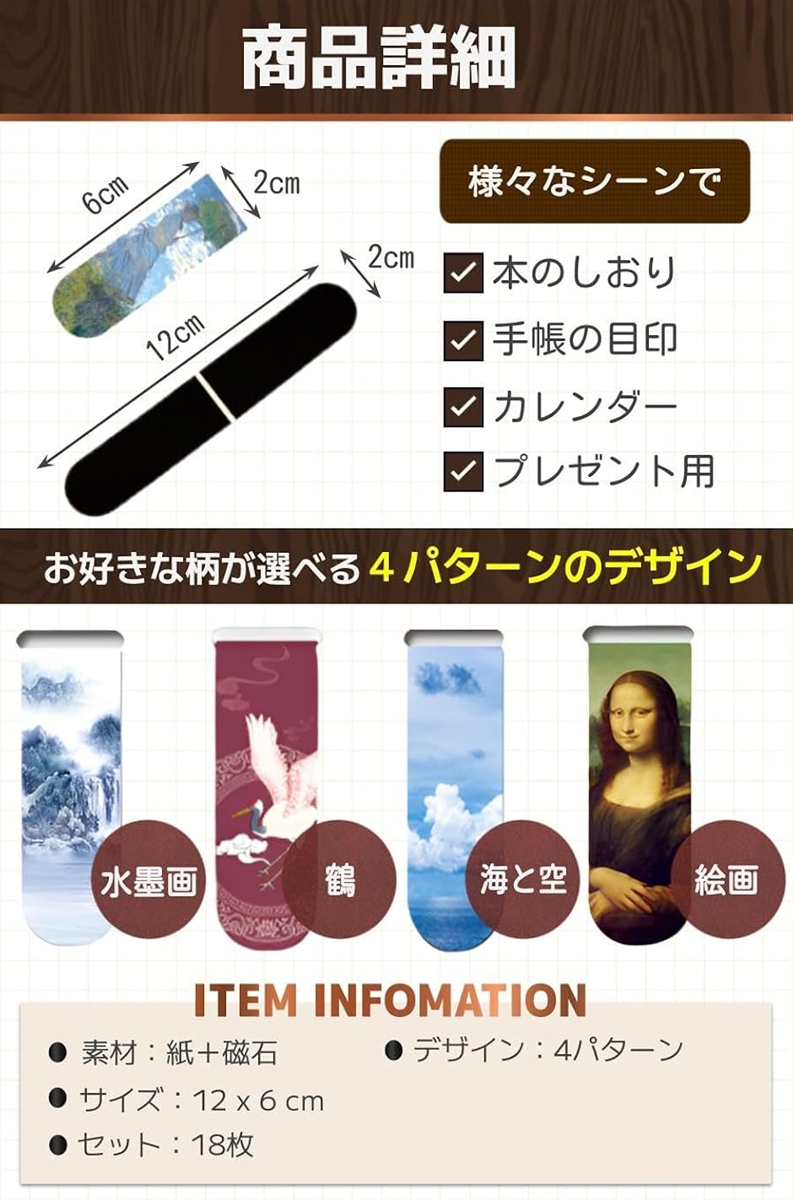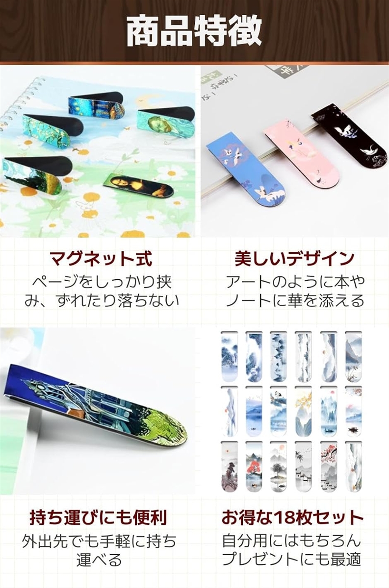 「商品特徴」(1)マグネット式:ページをしっかり挟み、ずれたり落ちない/(2)美しいデザイン:アートのように本やノートに華を添える/(3)持ち運びにも便利:外出先でも手軽に持ち運べる/(4)お得な18枚セット:自分用にはもちろんプレゼントにも最適