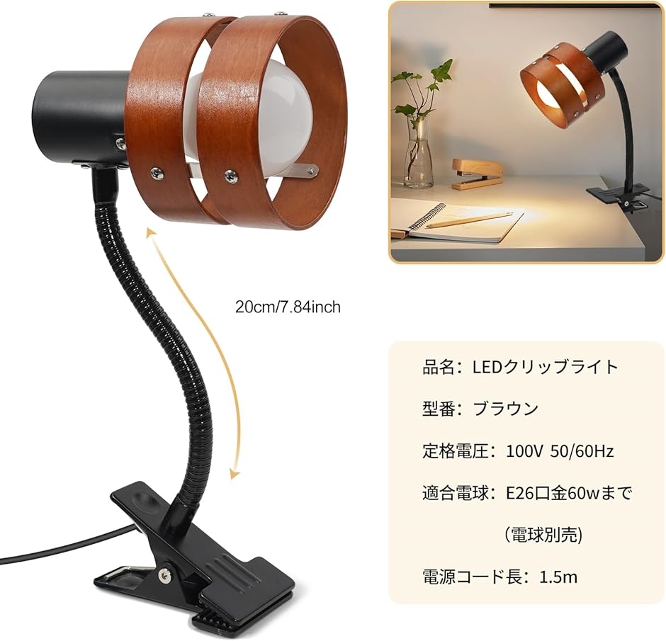 | 商品名 | クリップライト 茶色の木製の円 E26対応 360度回転 スイッチ付き 高級 目に優しい 節電 省スペース設計 寝室 ベッドサイド デスクライト 読書用 高級レストラン照明 植物育成ライト対応 |