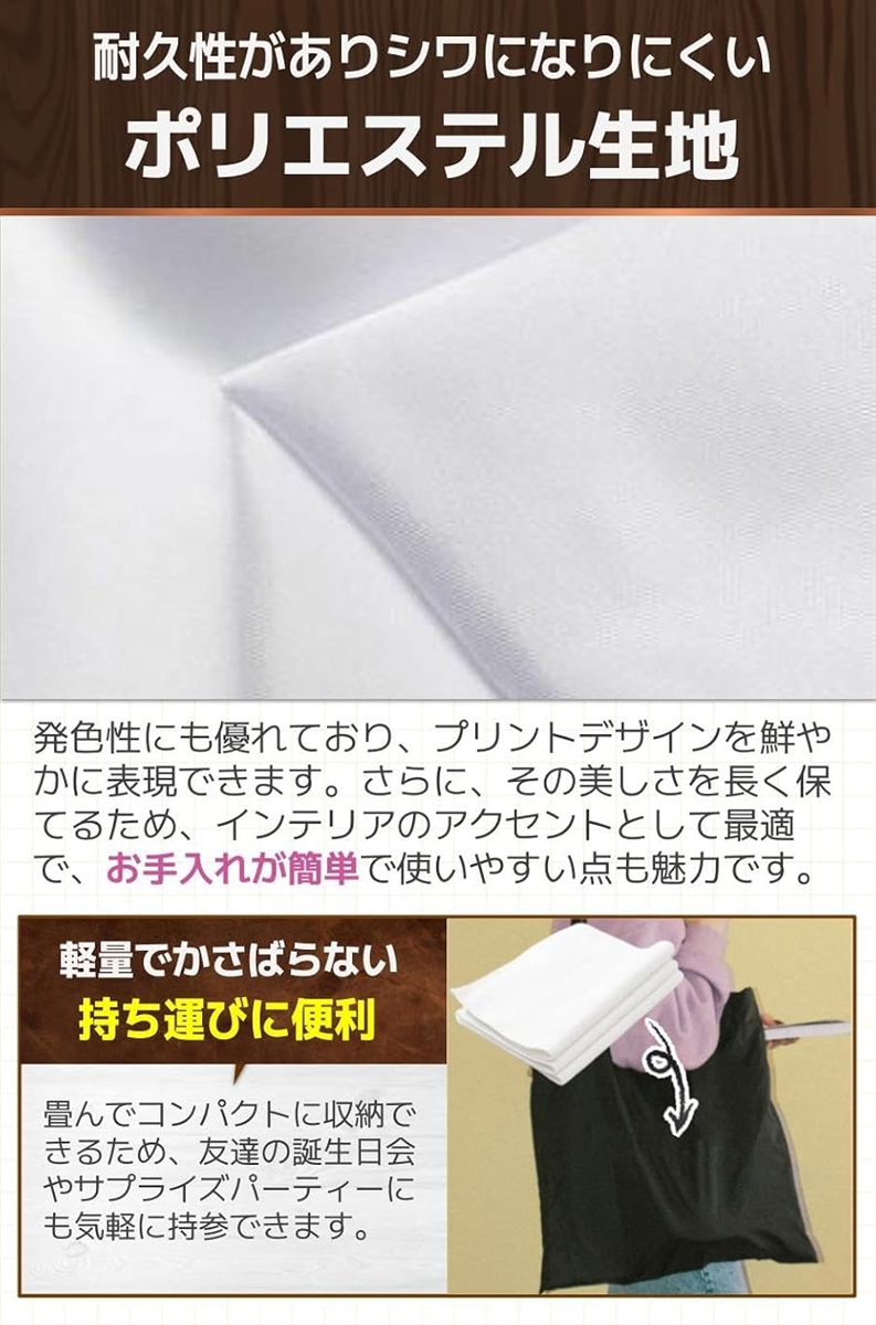 「商品特徴」(1)ポリエステル素材:耐久性が高くお手入れがしやすい/(2)魅力的なデザイン:幅広い世代で使用できる/(3)軽量で折りたためる:持ち運べて色んなシーンで活用できる/(4)選べる2サイズ展開:スペースに合うサイズが選べる