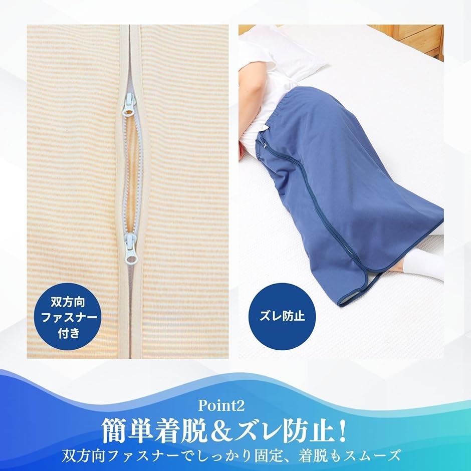簡単な着脱が魅力・フルオープンにできる双方向ファスナー式なので、テープやボタン式に比べてしっかり固定され、簡単に着脱ができ、使用中のズレを防ぎながらしっかりフィット。