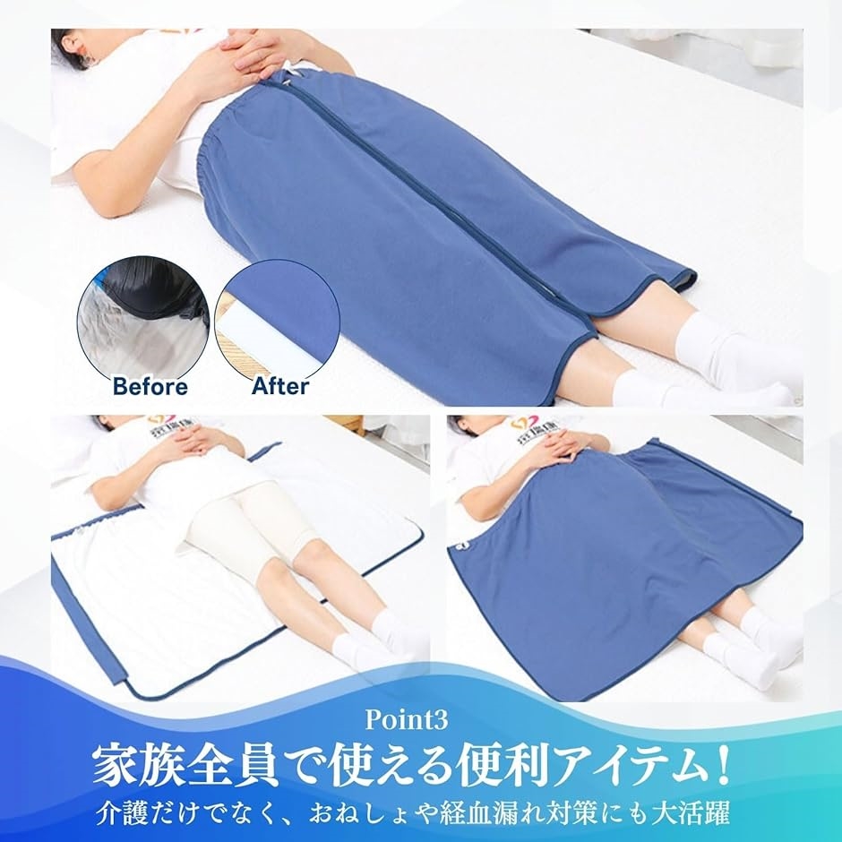 介護だけでなく、家族みんなで使える便利アイテム:高齢者から子供まで、ベッドシーツの上に広げたり、車のシートカバーに使ったり、ひざ掛けとしても活躍。