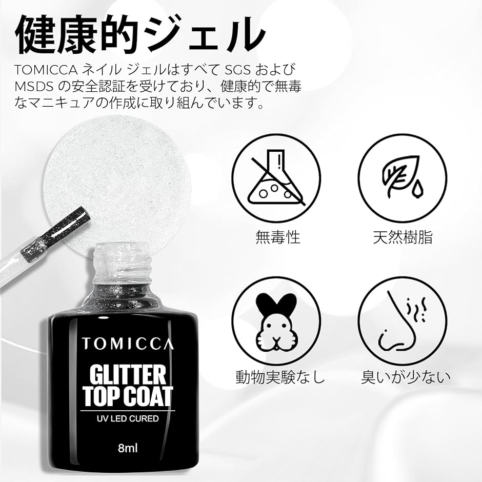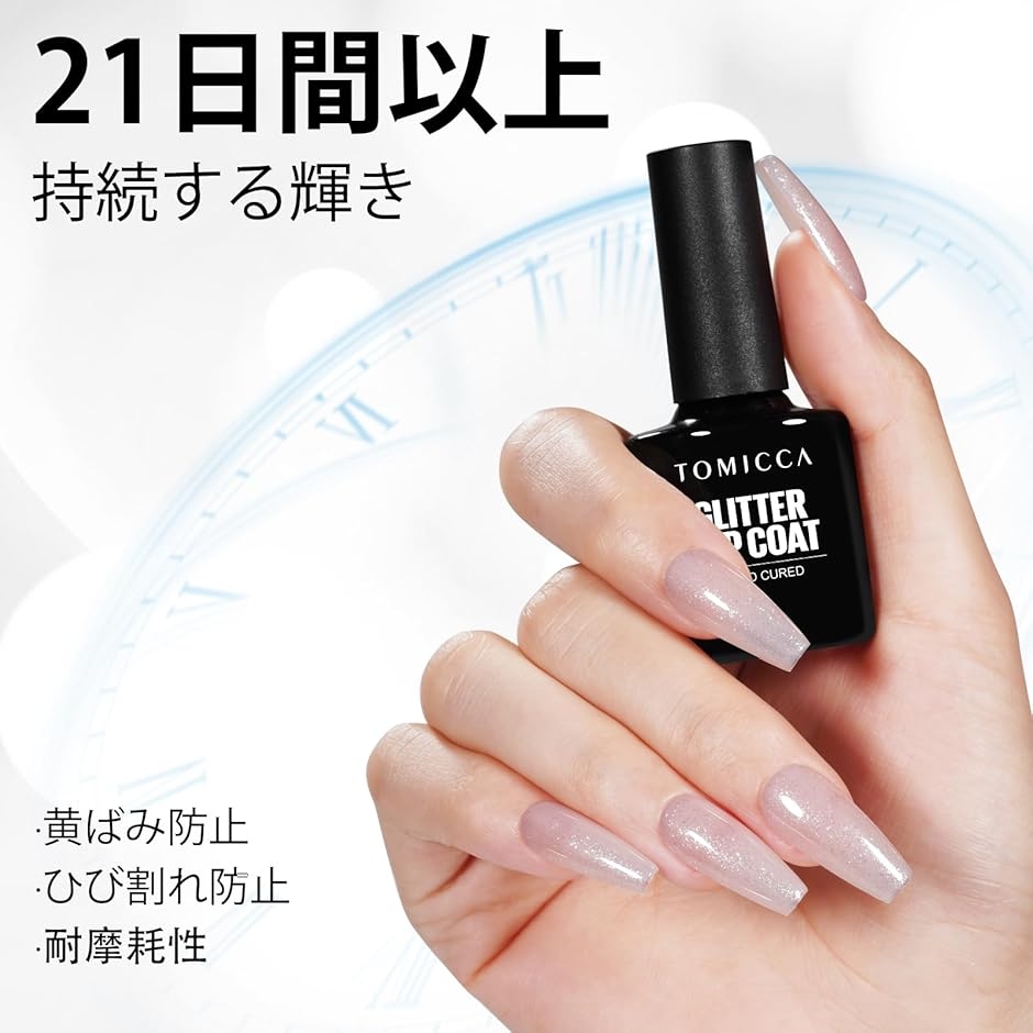 グリッター ジェル ネイル: TOMICCA は、この半透明のジェル ネイル 、キラキラ光る粒子のグリッターをたっぷり加えました。