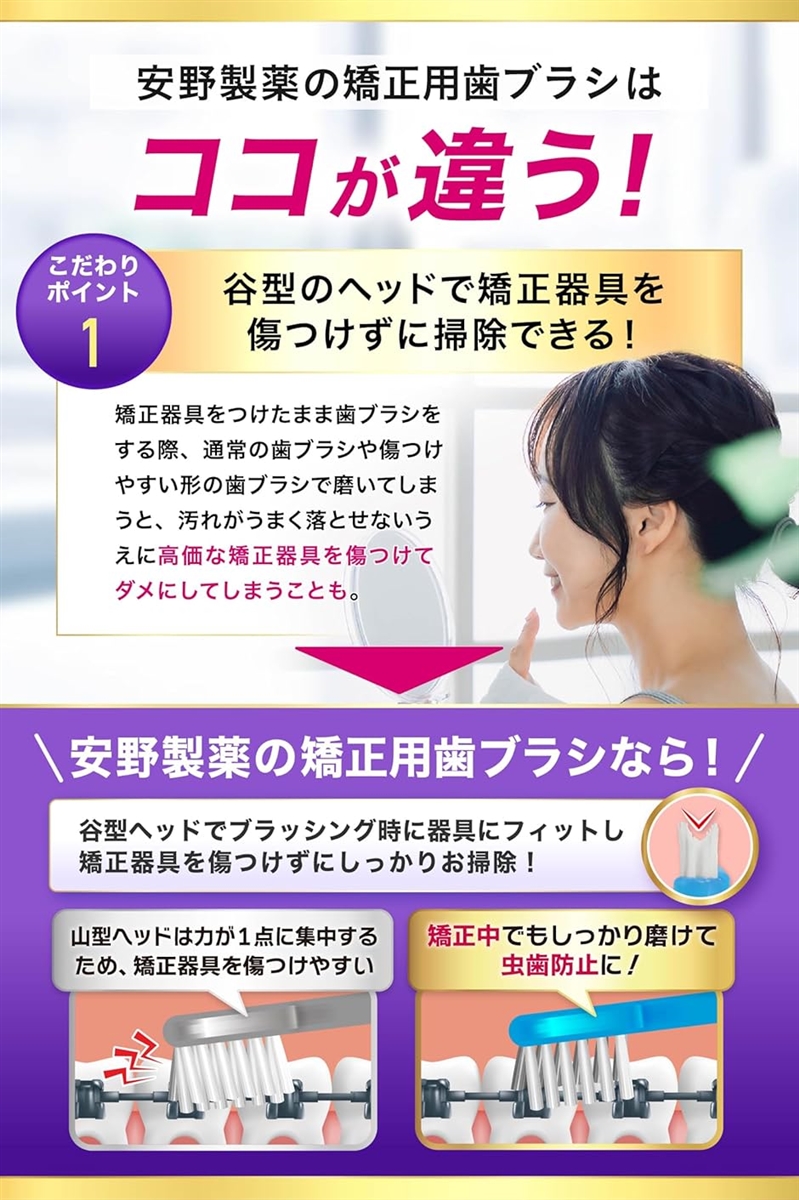 この歯ブラシは中央が凹んだ谷型ヘッドという特殊な形状により、ワイヤー矯正をしていてもブラッシングがしやすくなっています。