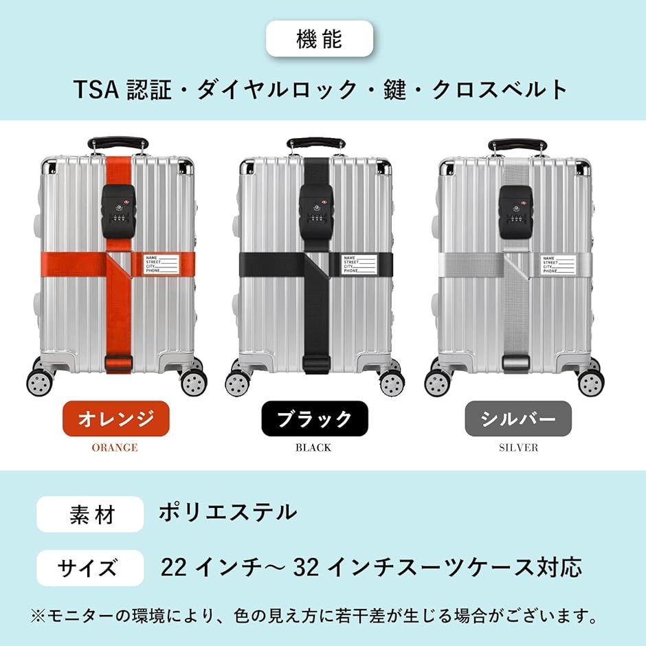 「素材」ポリエステル 「サイズ」22インチ〜32インチスーツケース対応 「機能」TSA認証、ダイヤルロック、鍵、クロスベルト 「カラー」ブラック、シルバー、オレンジ *モニターの環境により、色の見え方に若干差が生じる場合がございます。