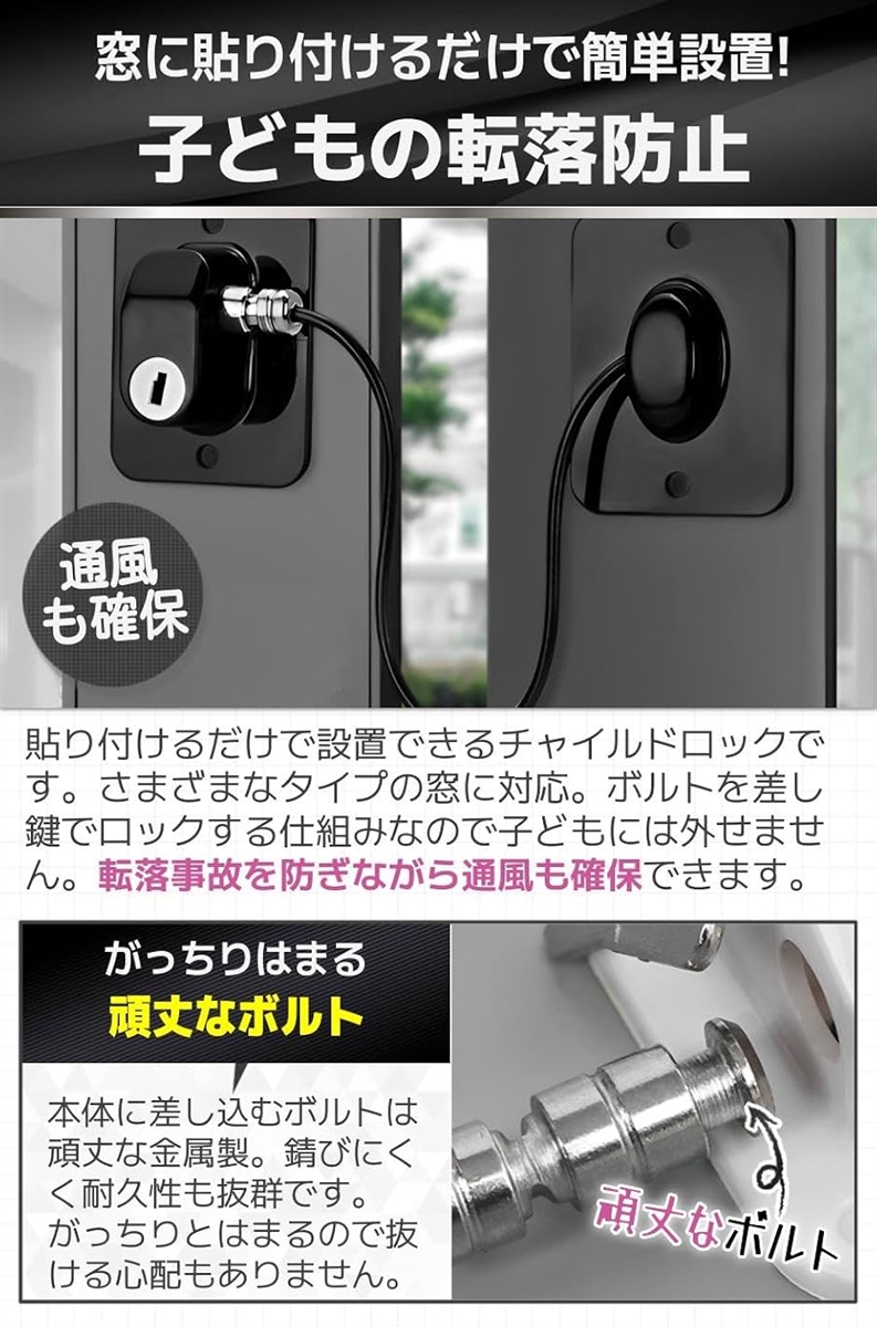 「商品特徴」(1)転落防止&通風確保:通風を確保しながら窓からの転落を防げる/(2)頑丈な金属製ボルト:耐久性抜群でがっちりはまる/(3)鍵でしっかりロック:鍵を回してロックすれば抜けない/(4)サイズや色を選べる:2色・3サイズから用途に合わせて選べる