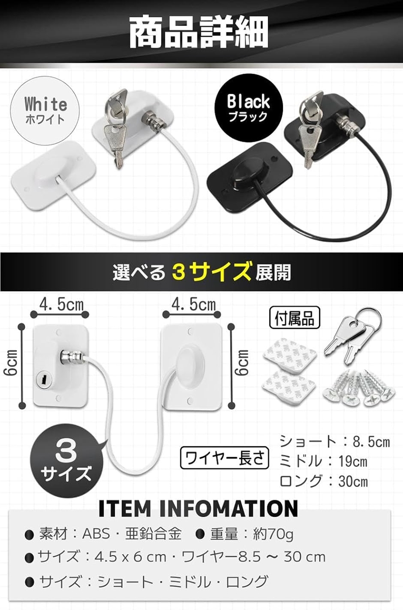 | 商品名 | 窓 ロック 網戸ロック 鍵 引き戸 鍵 引き出しロック 冷蔵庫 落下防止 ブラック ロング |