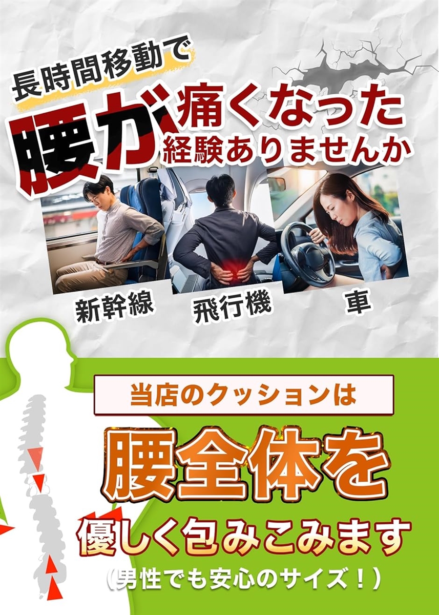 | 商品名 | 背中まで支えられる大判タイプ 腰枕 腰 クッション 理学療法士監修 新幹線 飛行機 オフィス エアー 背もたれ 持ち運び |